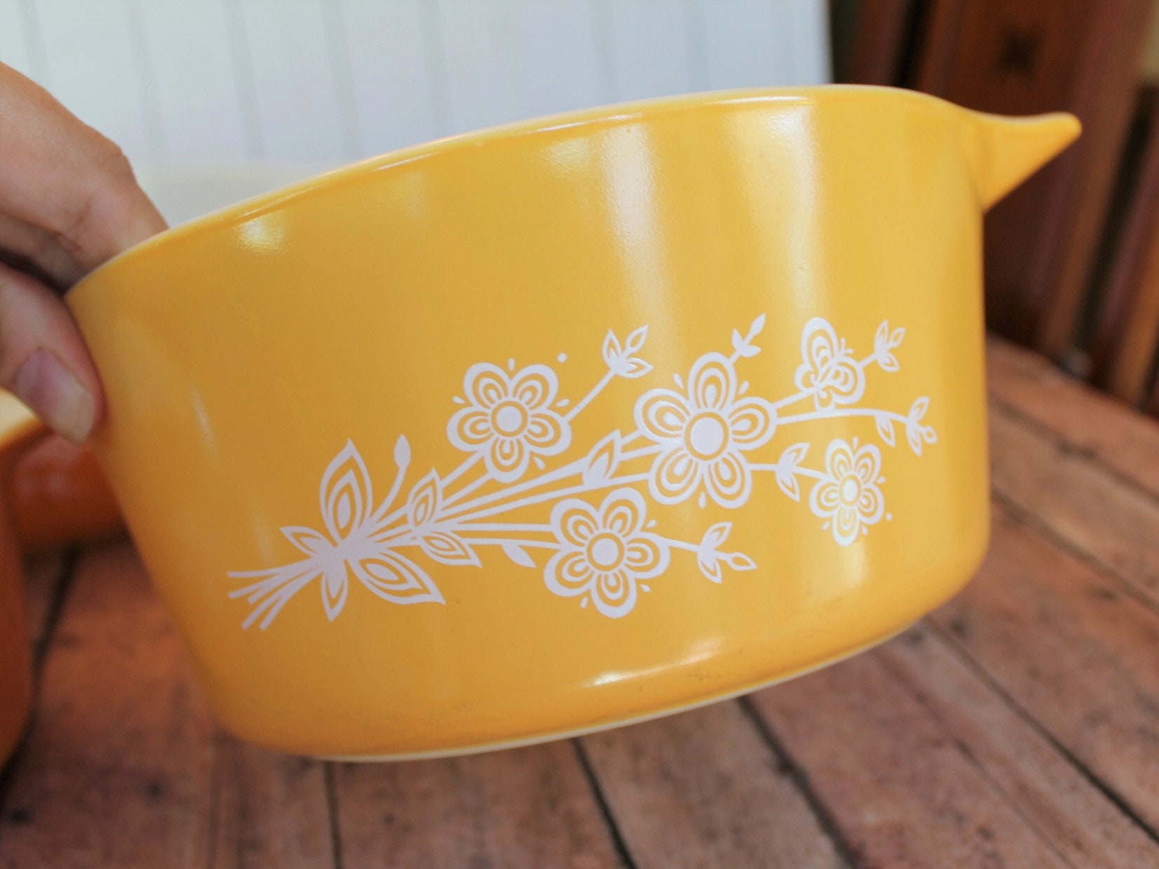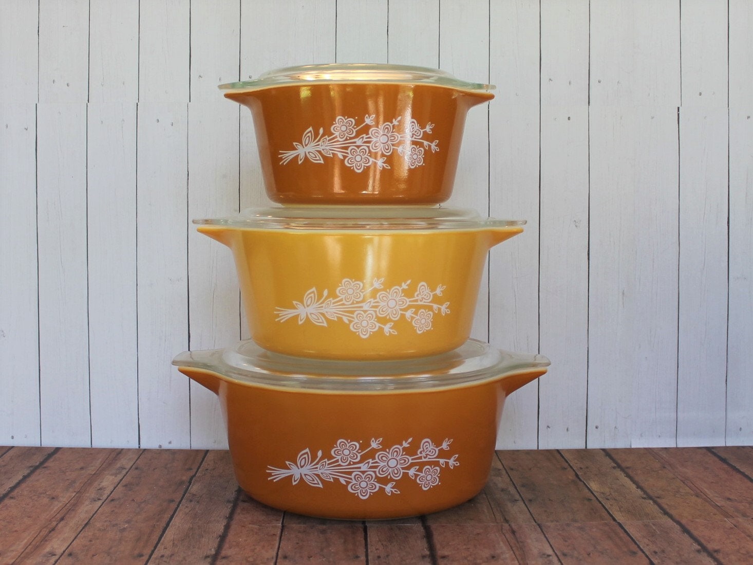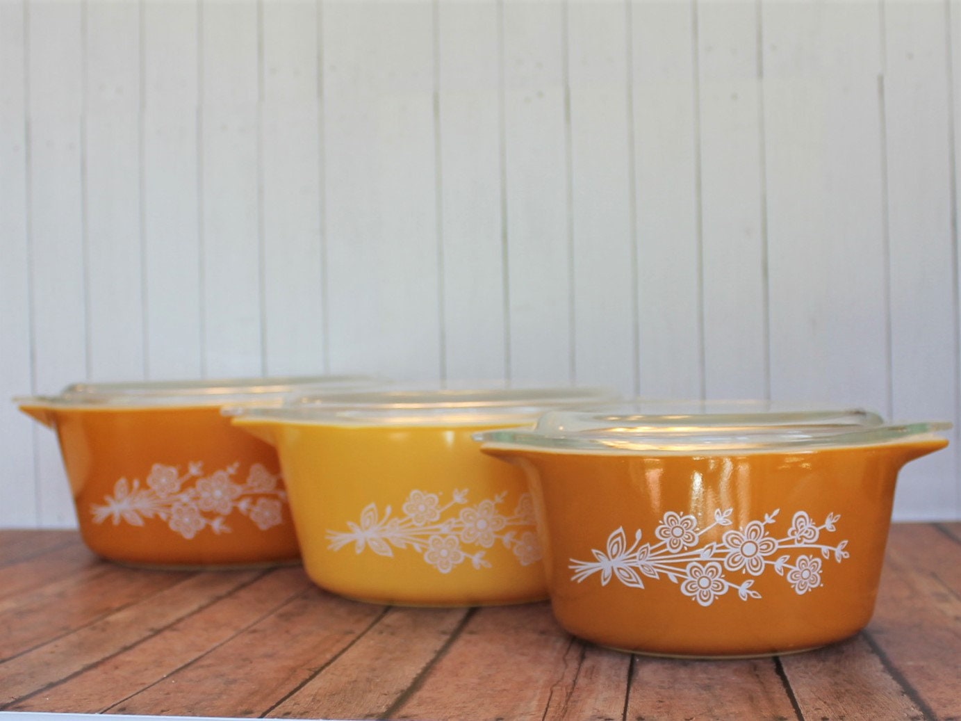 This set of 3 Pyrex round casserole dishes are in the revised Butterfly Gold pattern issues in 1979. These casserole dishes are orange with a white flower cluster design on both sides of casserole. All 3 of the dishes have their matching clear glass lids. Included in this set are: