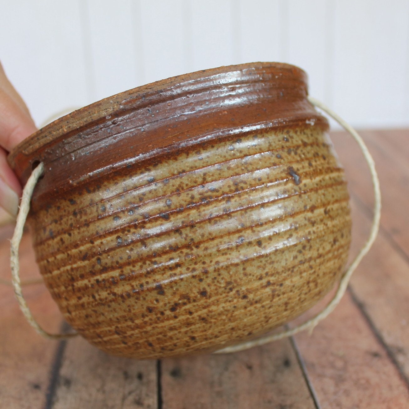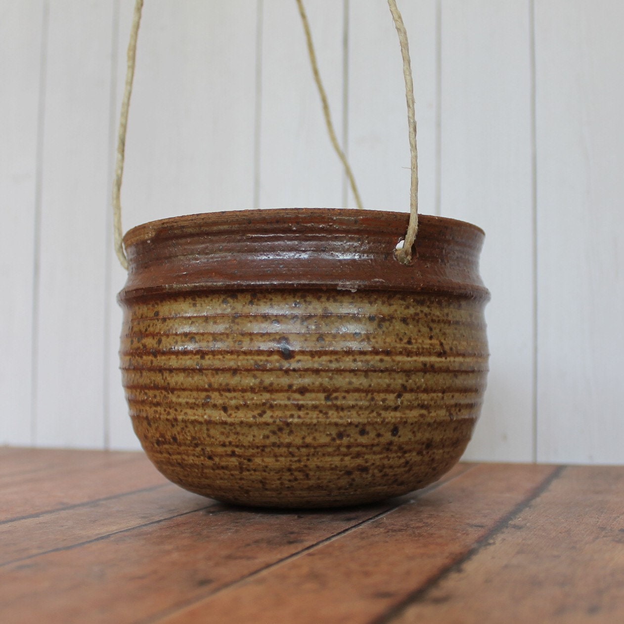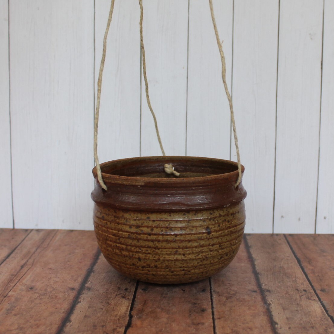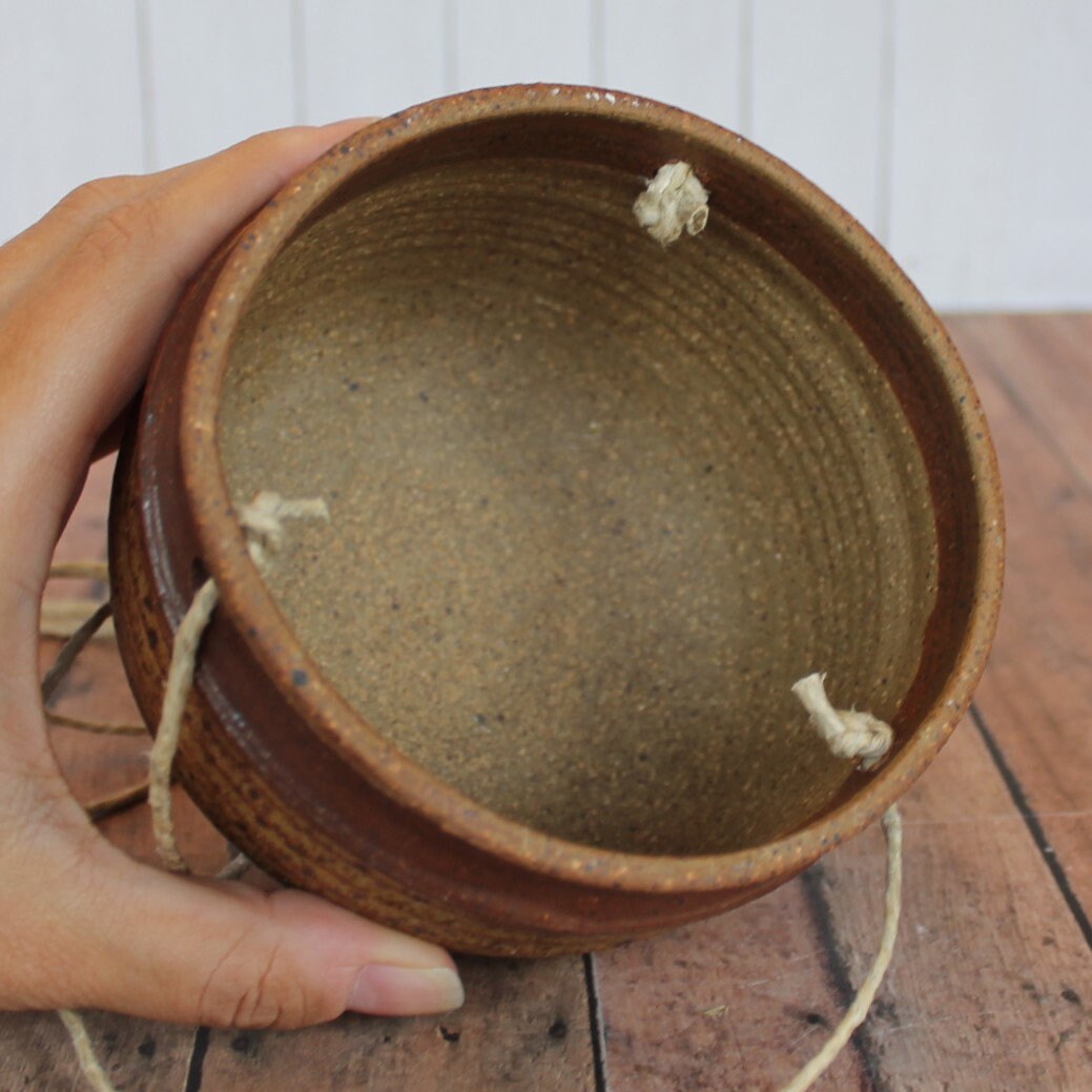 This stoneware hanging planter is a tan ceramic with a brown band around the rim. The planter is 3.5" tall and 4.5" in diameter. It has a subtle ribbed or banded design horizontally around the piece. The planter has 15" long twine cord hanger. There is no drainage hole in this piece.