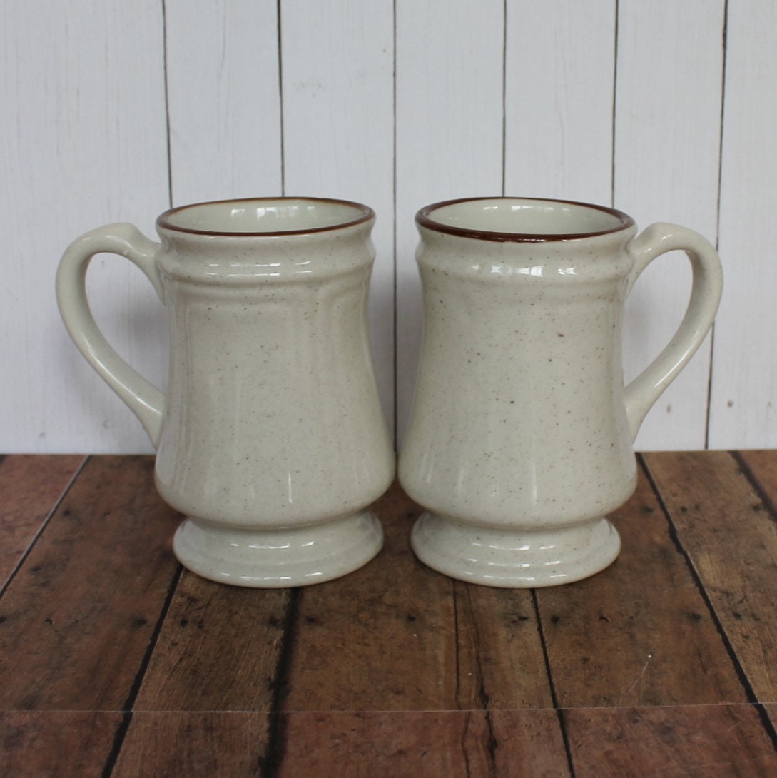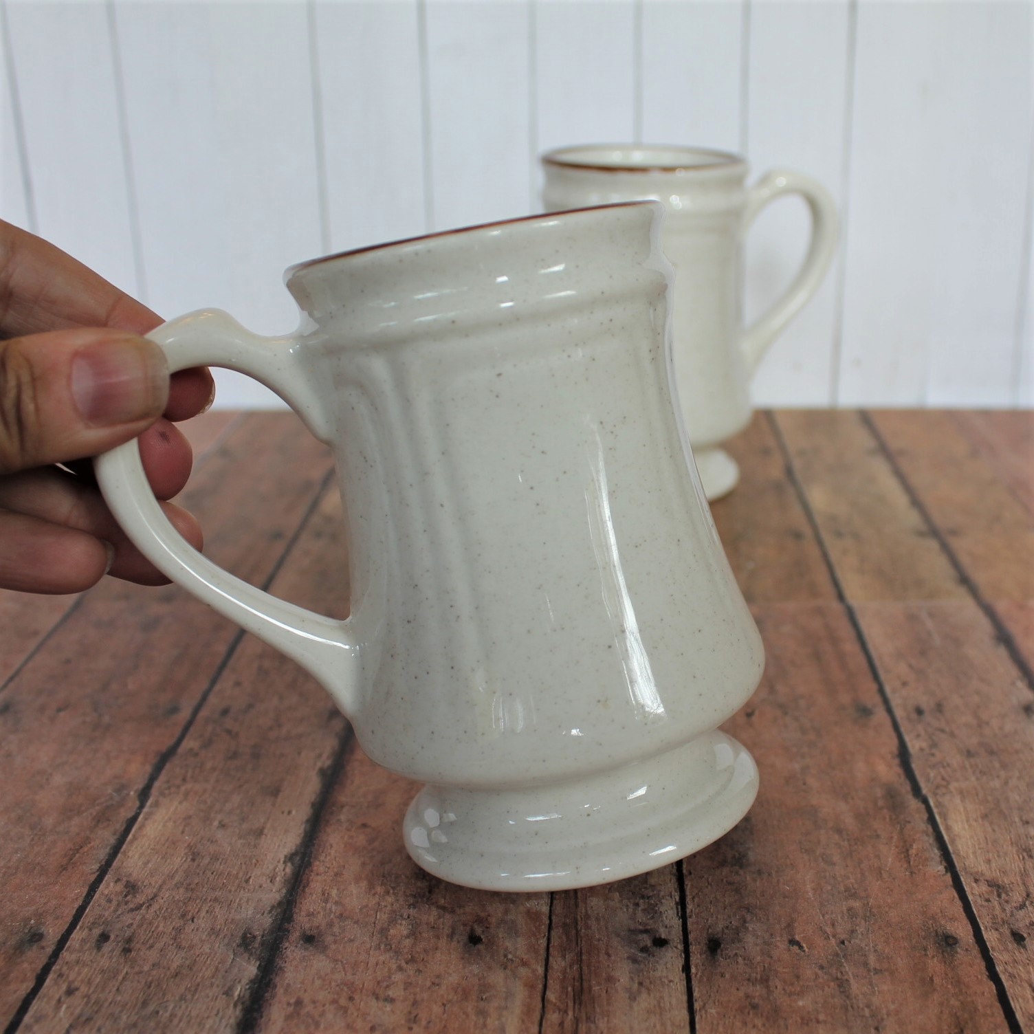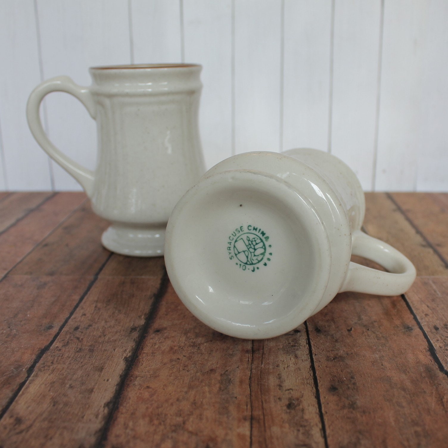 This nice set of 2 Syracuse China footed mugs are a white ceramic with light brown flecks to create a speckled effect. The mug is decorated with raised rectangular panels around the mug. The top is decorated with a simple brown band.