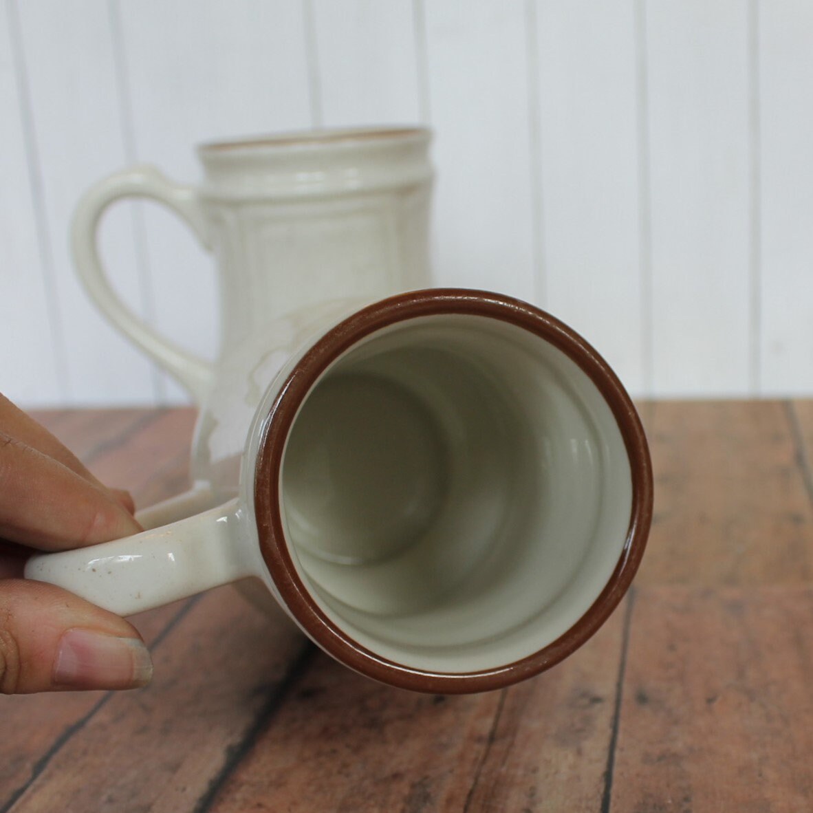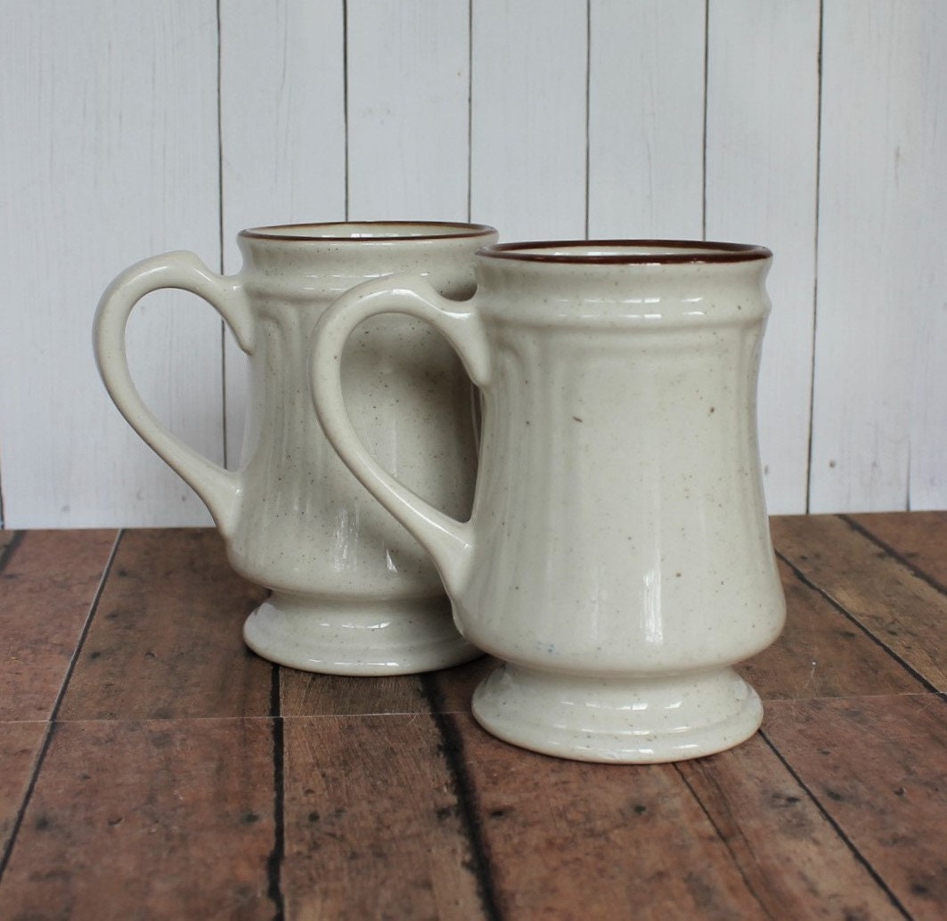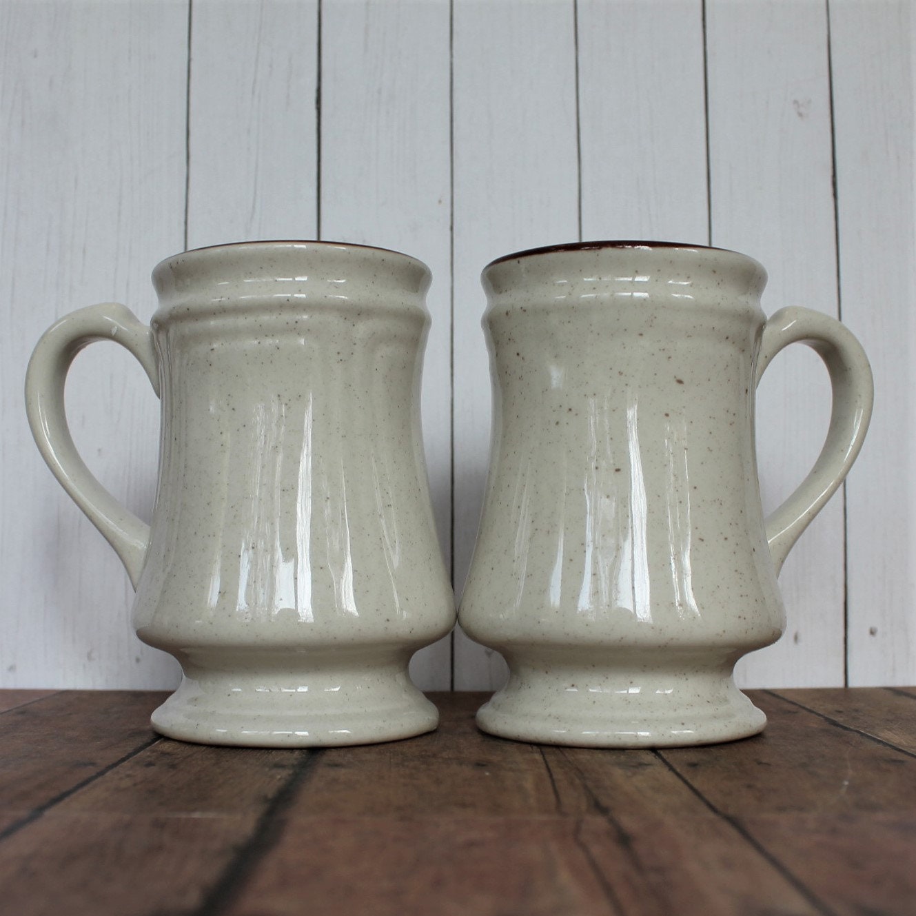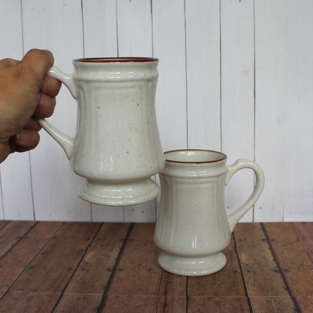 This nice set of 2 Syracuse China footed mugs are a white ceramic with light brown flecks to create a speckled effect. The mug is decorated with raised rectangular panels around the mug. The top is decorated with a simple brown band.