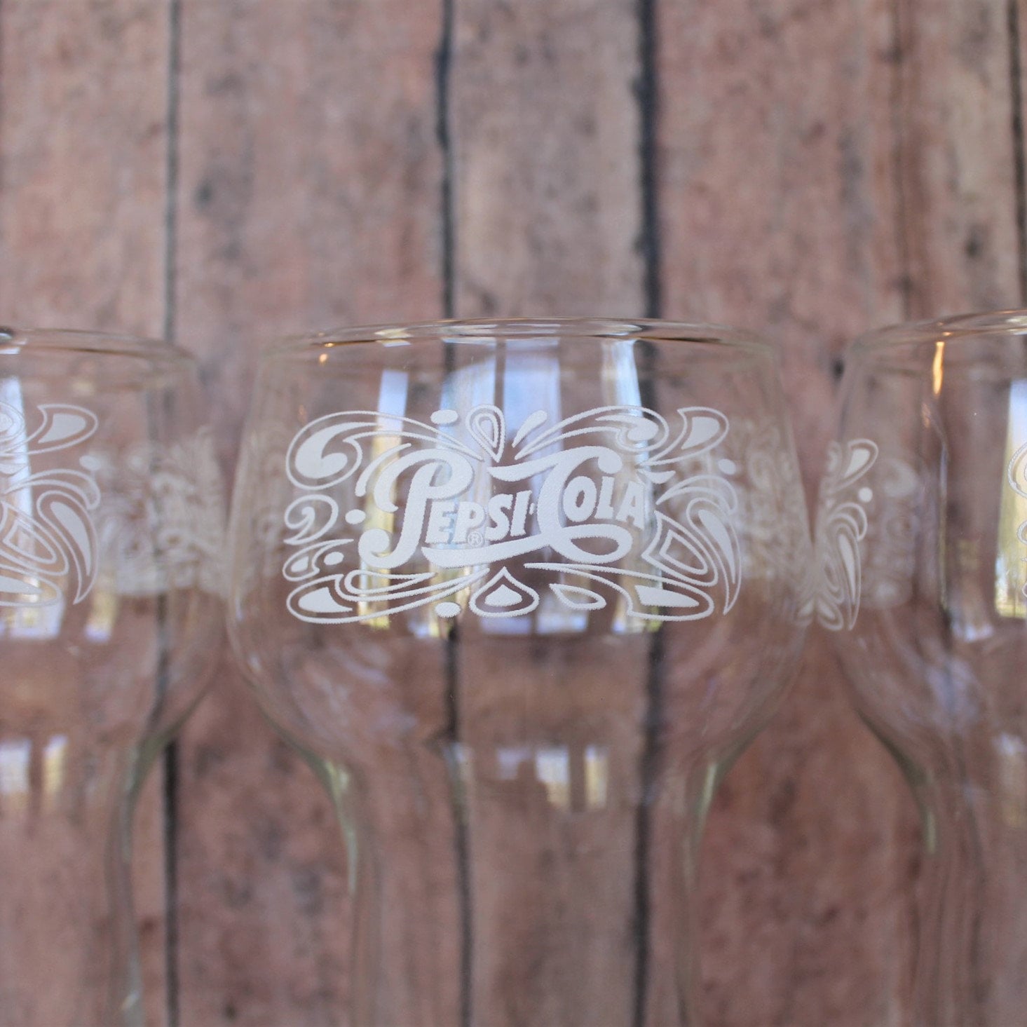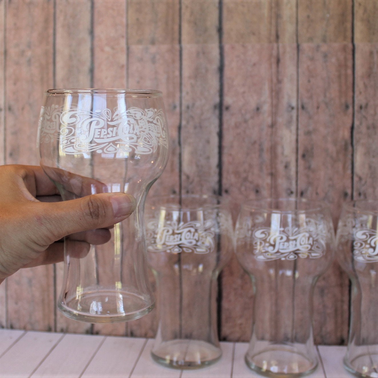 This set of 4 tumblers by Pepsi Cola are 6" tall and 3" in diameter. They are a clear glass and have a white scrolling design around the top of the glass and say PEPSI COLA. All 4 glasses are in very good condition with no chips or cracks. The pattern on the glasses is bright and clear. Nice set of Pepsi tumblers!