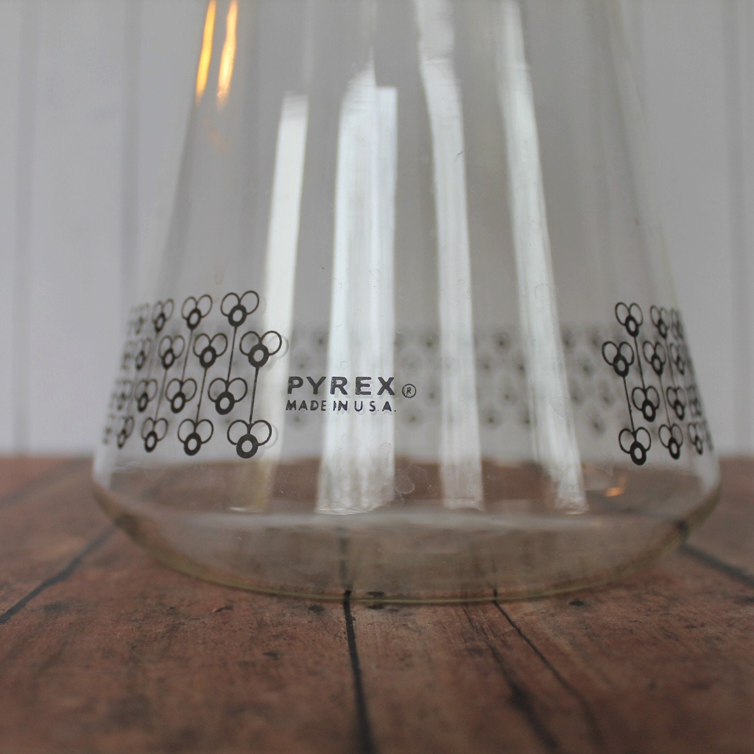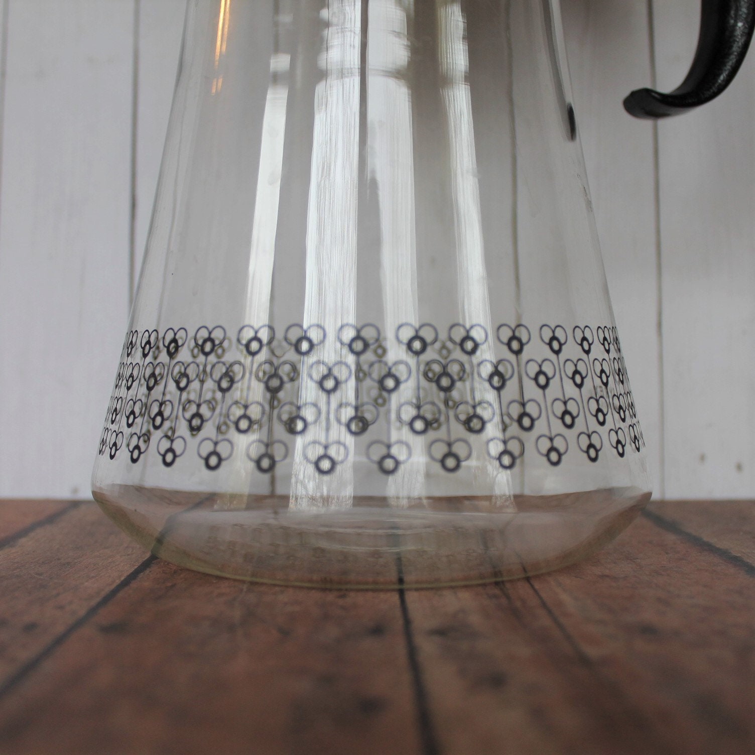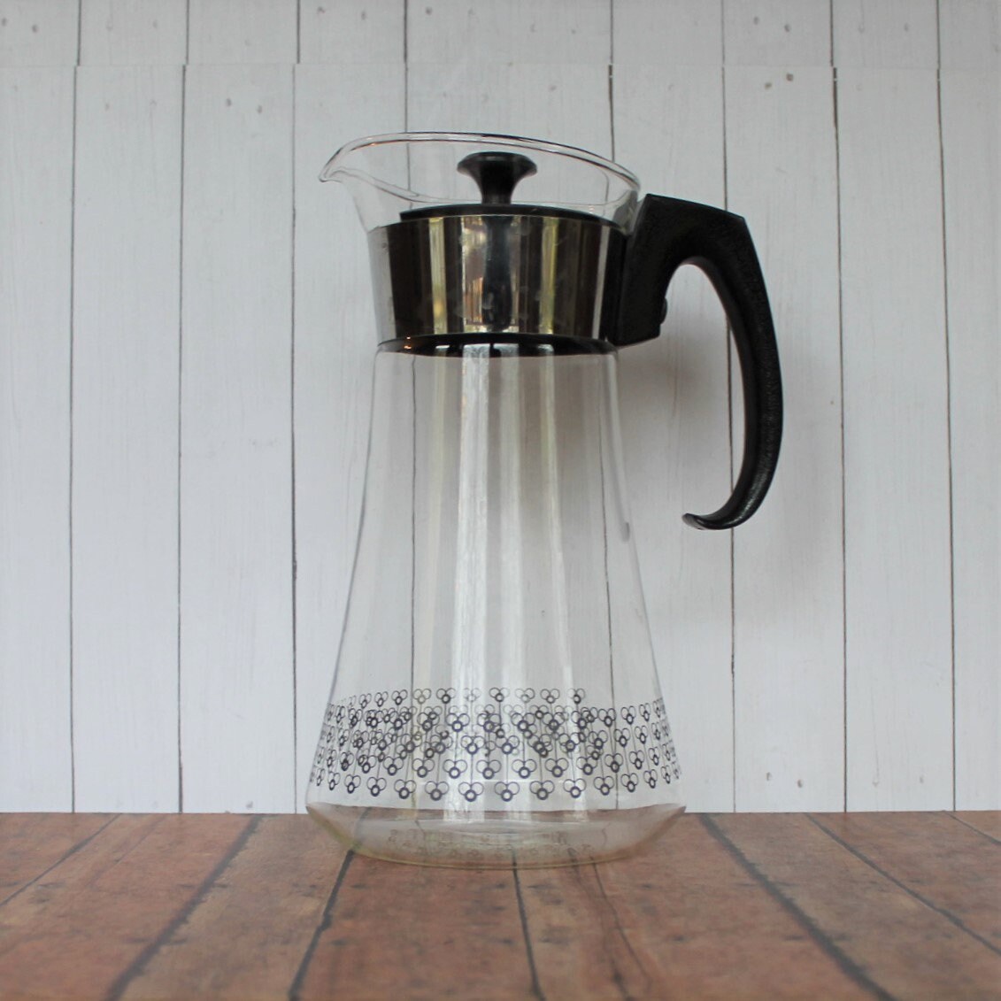 This great Pyrex coffee pot or carafe is a clear glass piece with a black plastic handle and a silver metal accent band around the neck of the pot. The pot is 10.5" tall and 5.5" in diameter at the base. The clear glass is decorated with a repeating modern flower design in silver around the base of the pot. The handle and lid of the pot are a black plastic. The side of the pot is marked: PYREX / MADE IN USA.