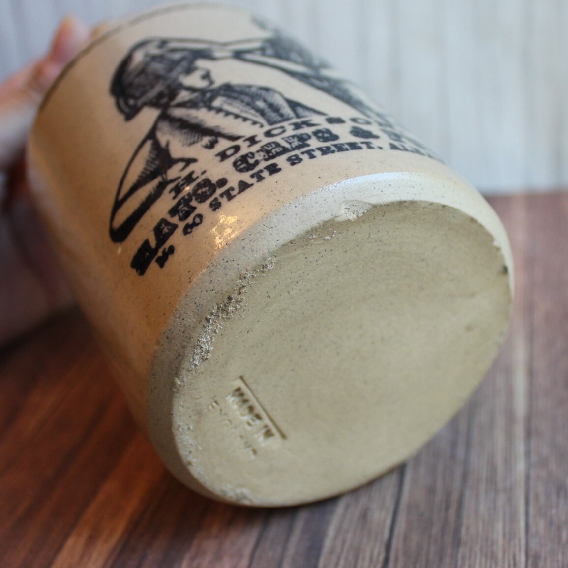 This small stoneware bottle is 5.75" tall and 3.5" in diameter. It is a gray stoneware bottle and has an open top with a pour spout on one side. The front of the bottle is decorated with a scene of 2 men trying on hats, and reads: H. DICKSON / HATS, CAPS & FURS / 60 STATE STREET, ALBANY. The bottom of the bottle is stamped: MADE IN ENGLAND.