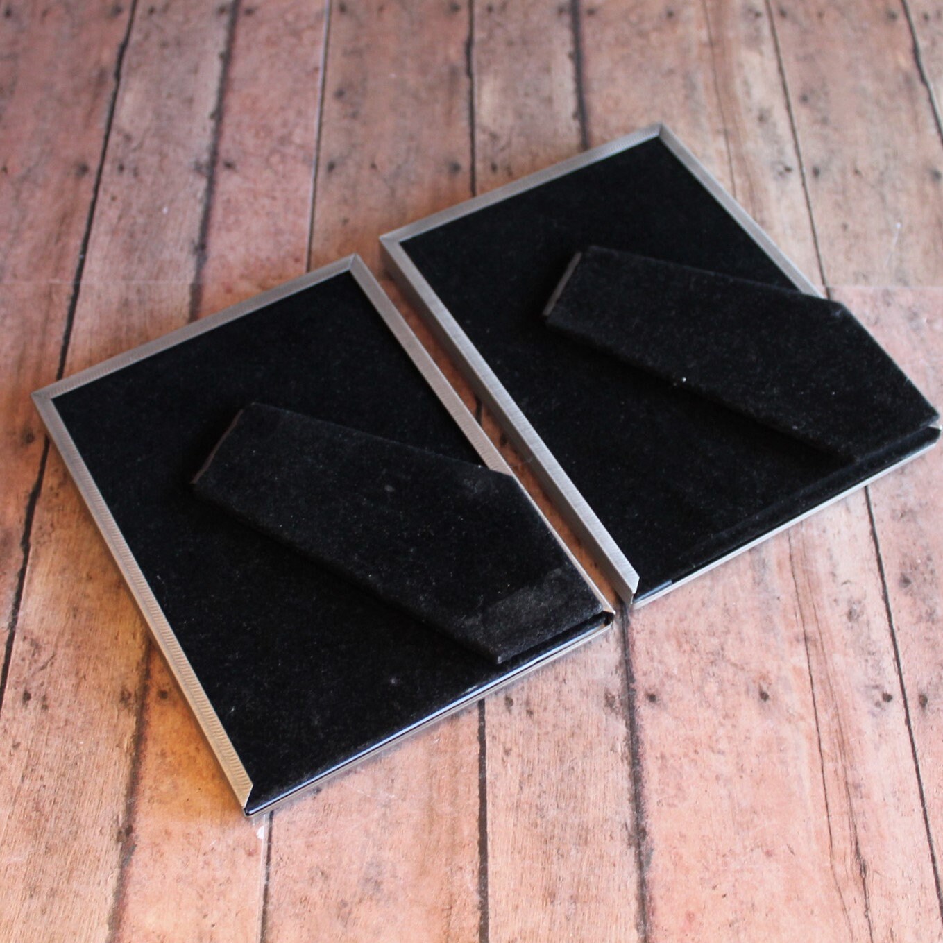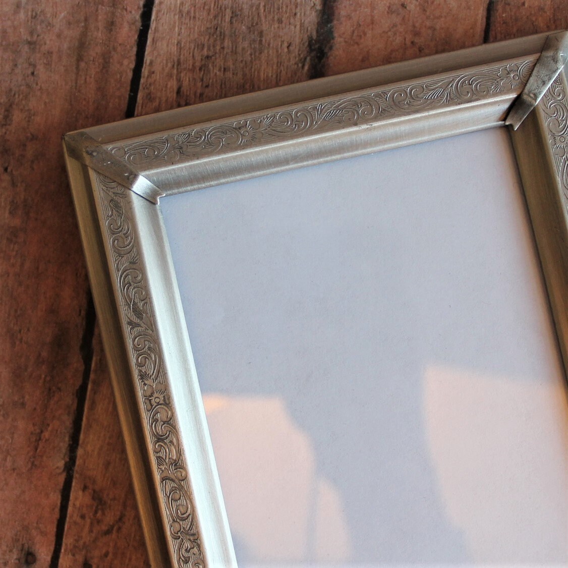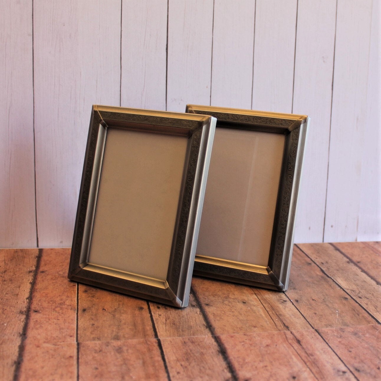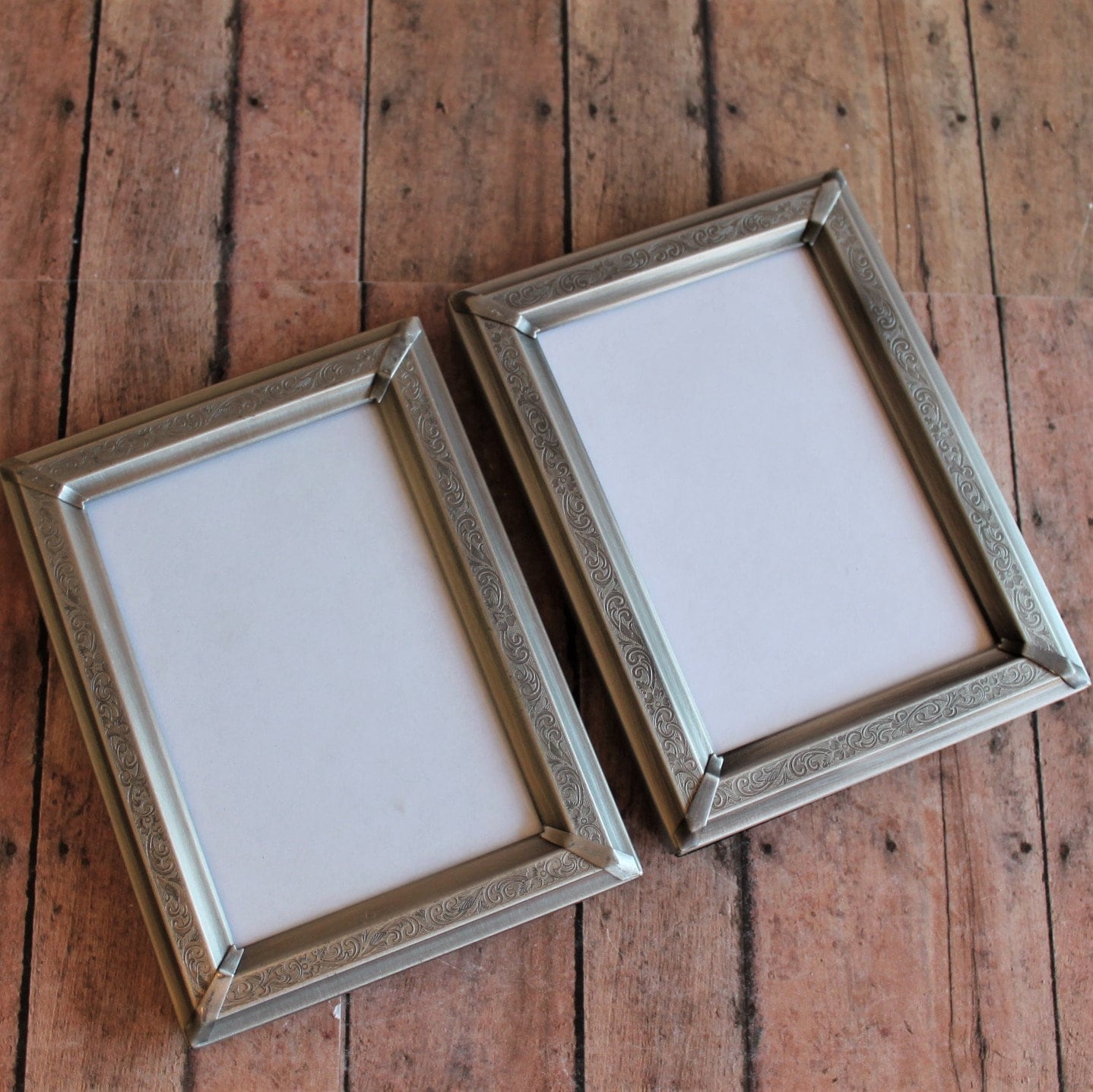 This set of frames includes 2 silver 3.5x5 frames. Both frames are 3.5" x 5" size, and have a piece of clear glass over the photo opening and a cardboard backing piece with a photo stand. The frames can fit a 4x6 photo, but only 3.5 x 5 of the photo will show through the opening. The frames have a nicely etched scroll and leaf design around the frames. The photos can stand either vertically or horizontally.