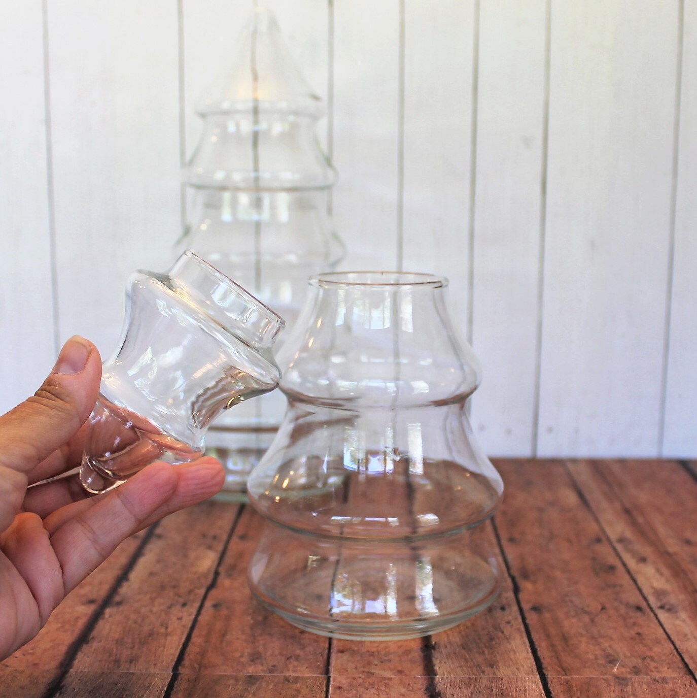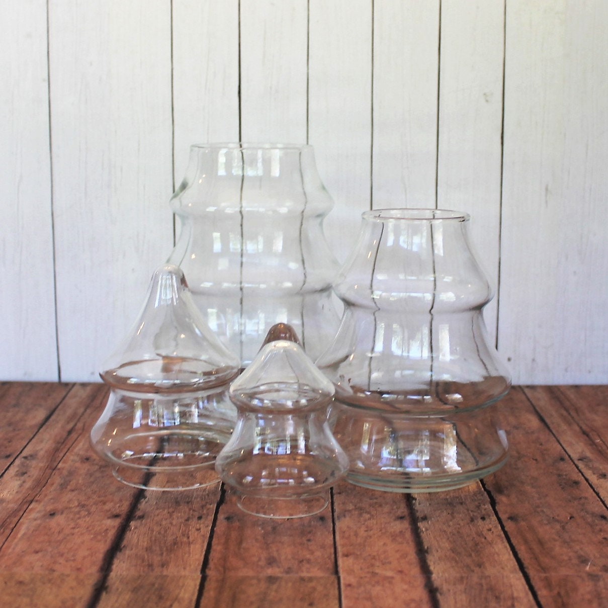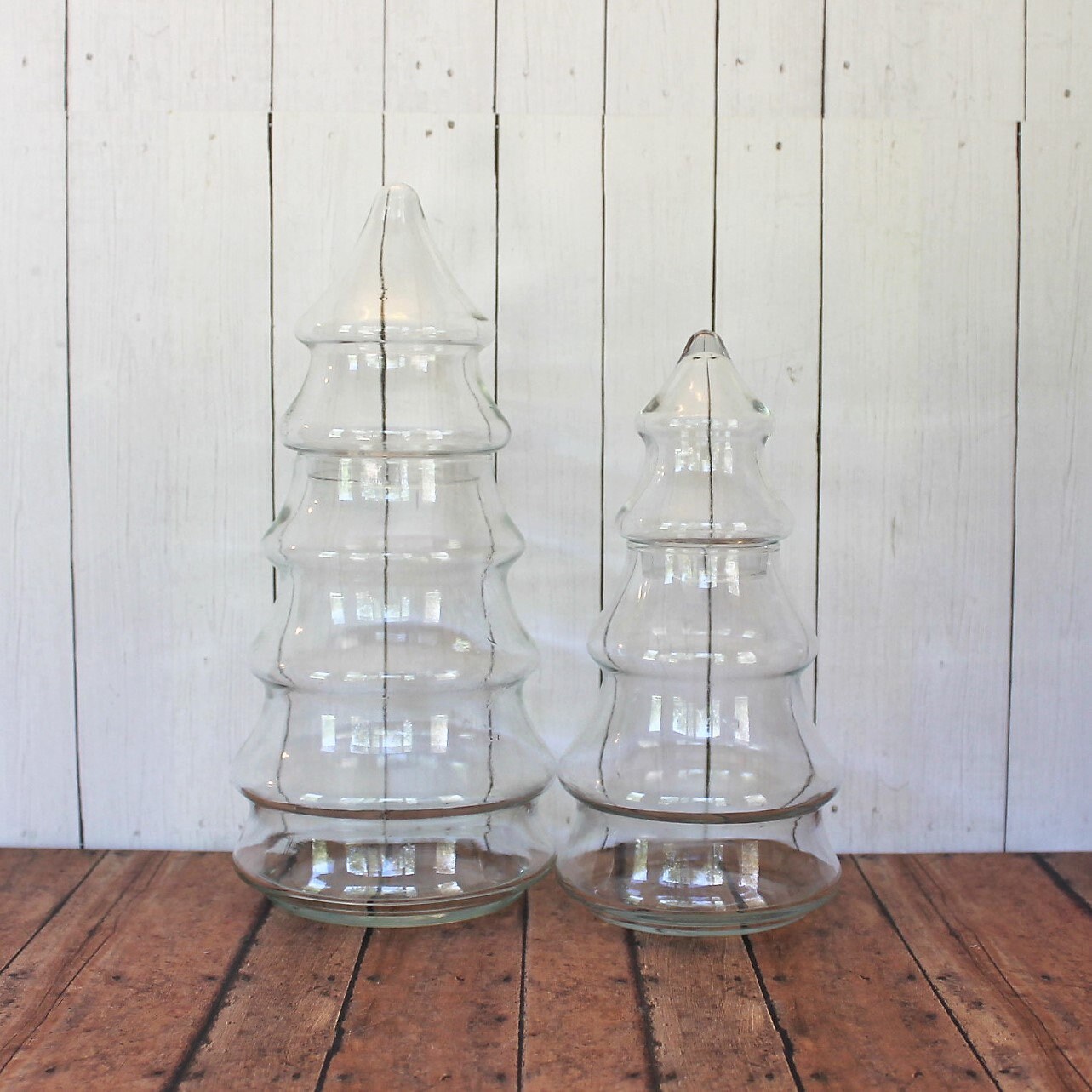 This set of clear glass Christmas tree jars includes 2 jars in the same style - one larger jar and one smaller jar. The larger jar is 10.5" tall and 5" in diameter at the base, and the smaller is 8.5" tall and 3.5" in diameter. The tops of the jars lift off about 1/3 of the way down.