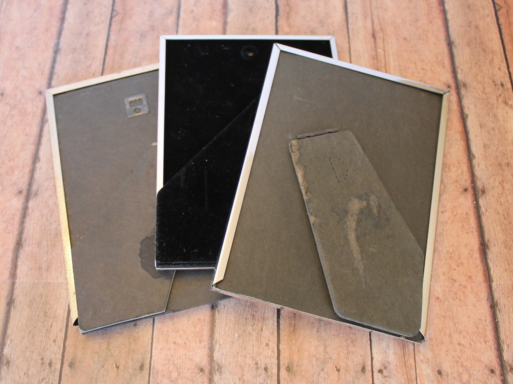 All 3 frames are in very nice condition, and have a piece of clear glass over the photo opening and a cardboard backing piece with a photo stand. There is some light tarnish here and there.