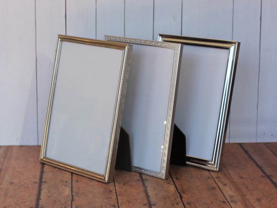 This set of frames includes 3 coordinating silver colored frames. All 3 frames are 5x7 size and have a nicely detailed traditional design around the frames. The photos can stand either vertically or horizontally. Two of the frames are more glossy, and one has more of a matte finish.