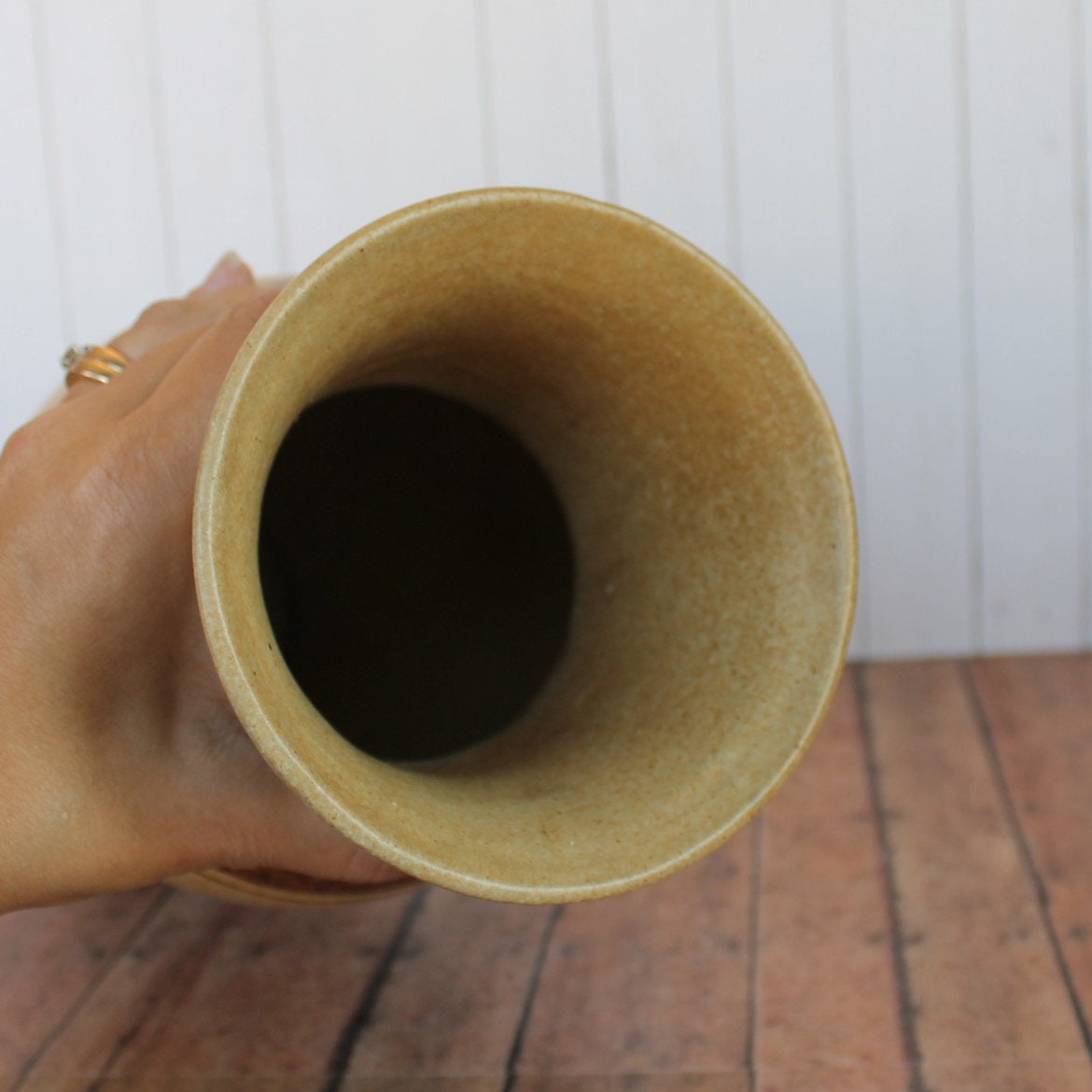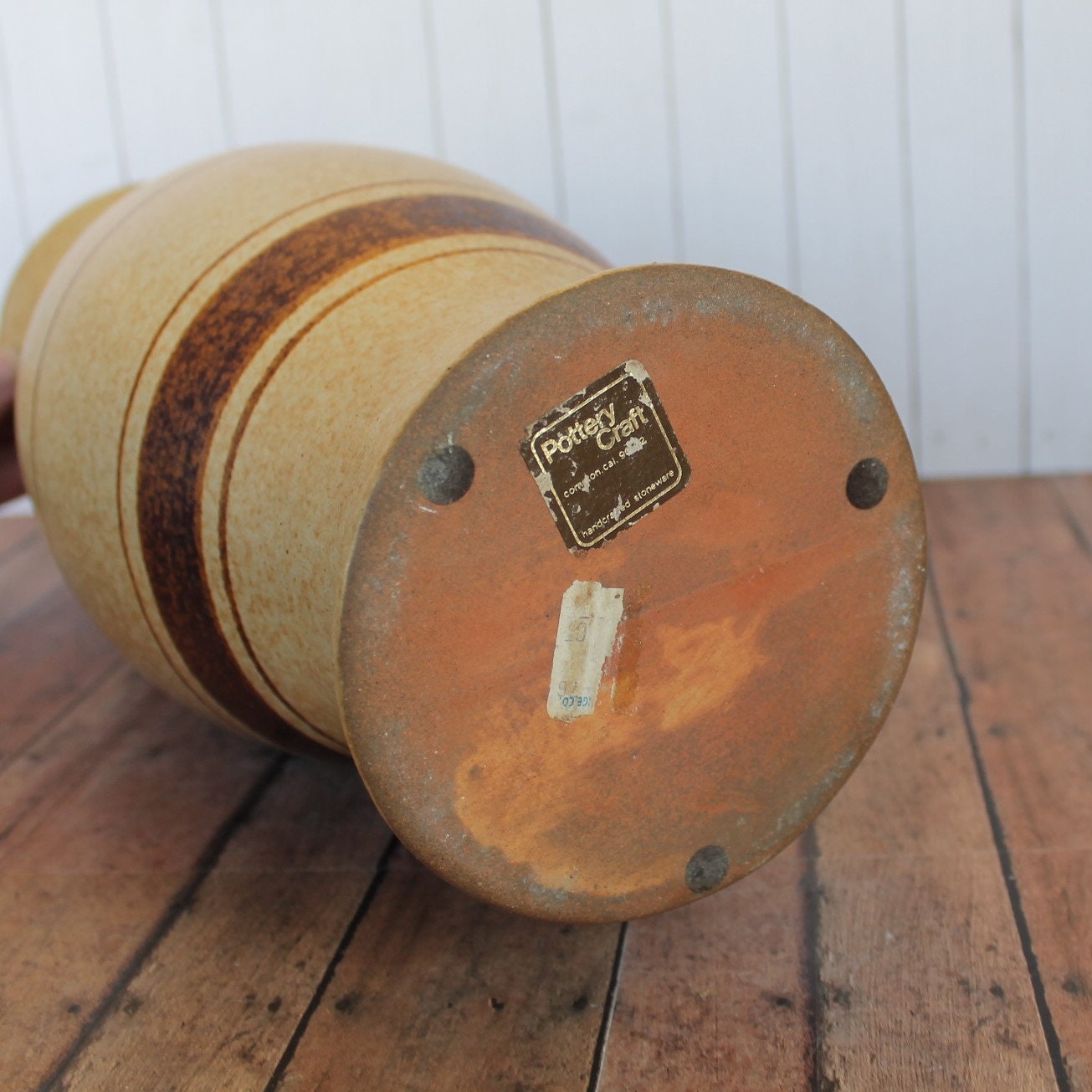 This large Pottery Craft vase is a light tan or cream stoneware, and has a brown banded designs. The vase is 13.5" tall and 6" in diameter, and the vase has a rounded shape. The vase has an original Pottery Craft label on the bottom.