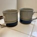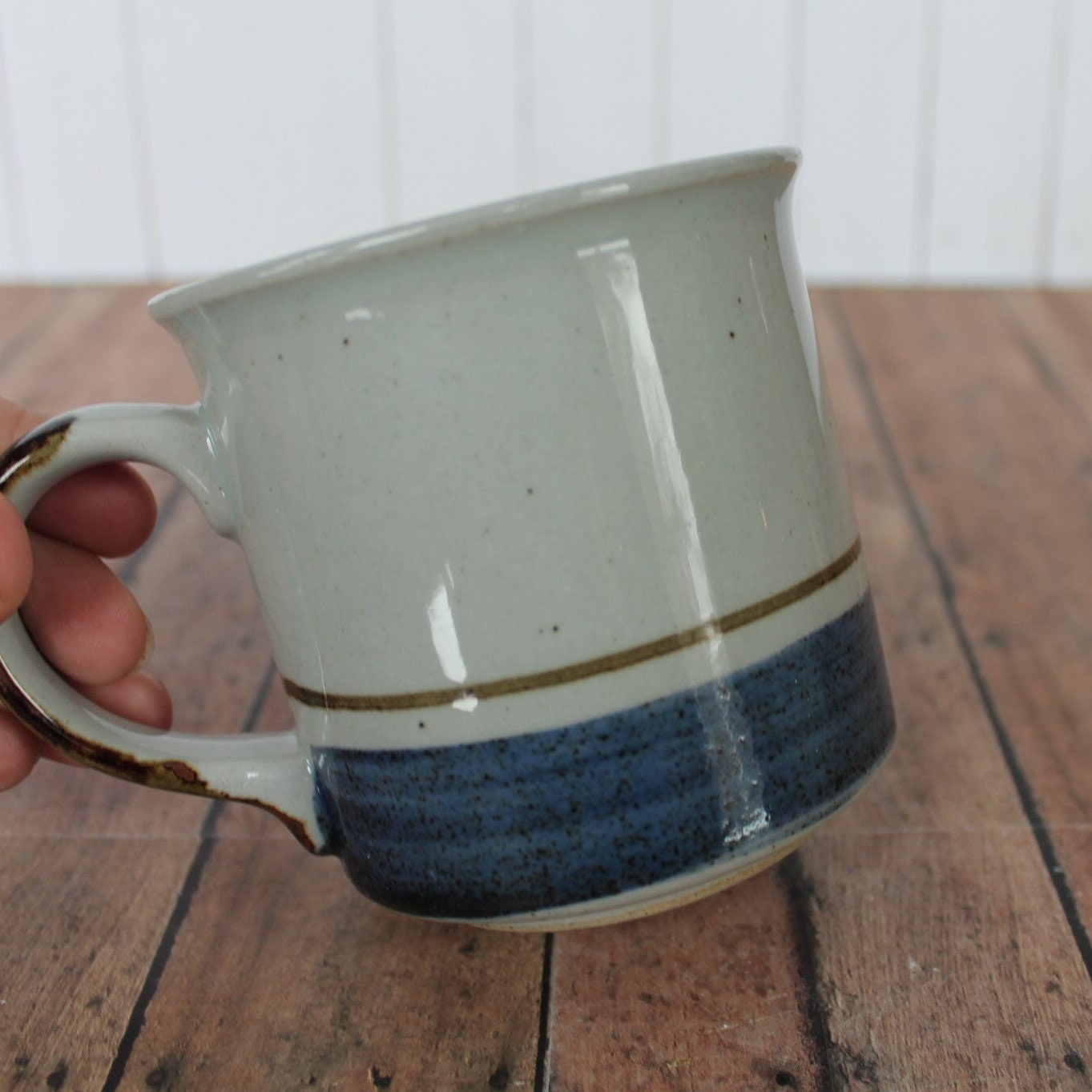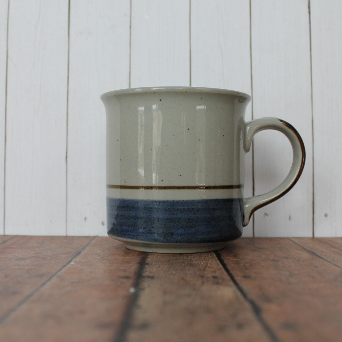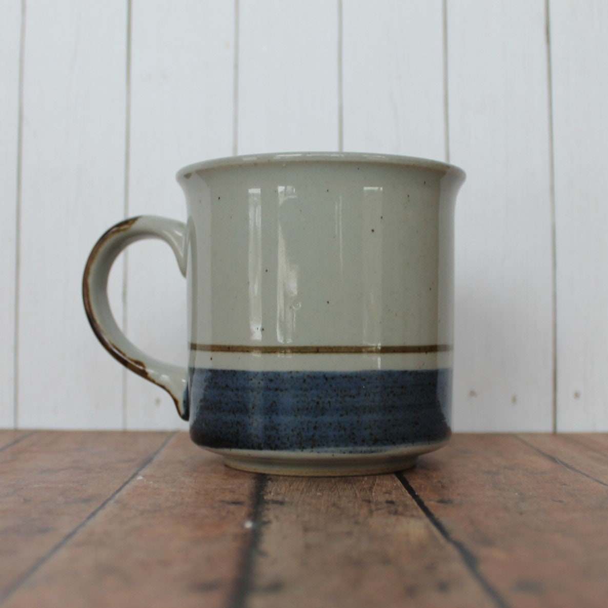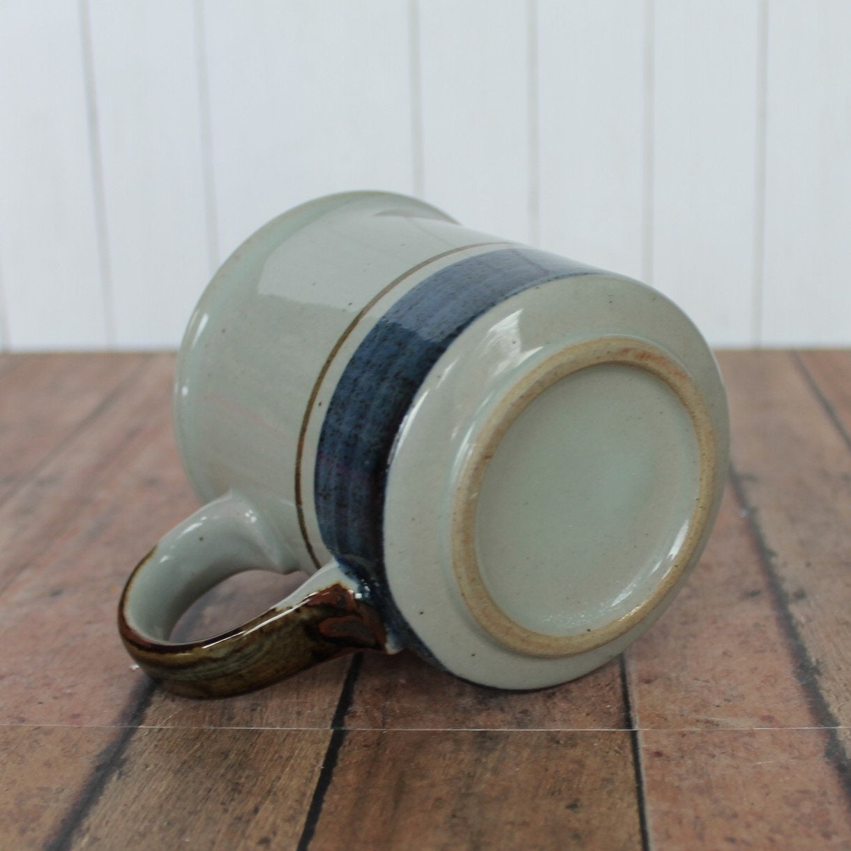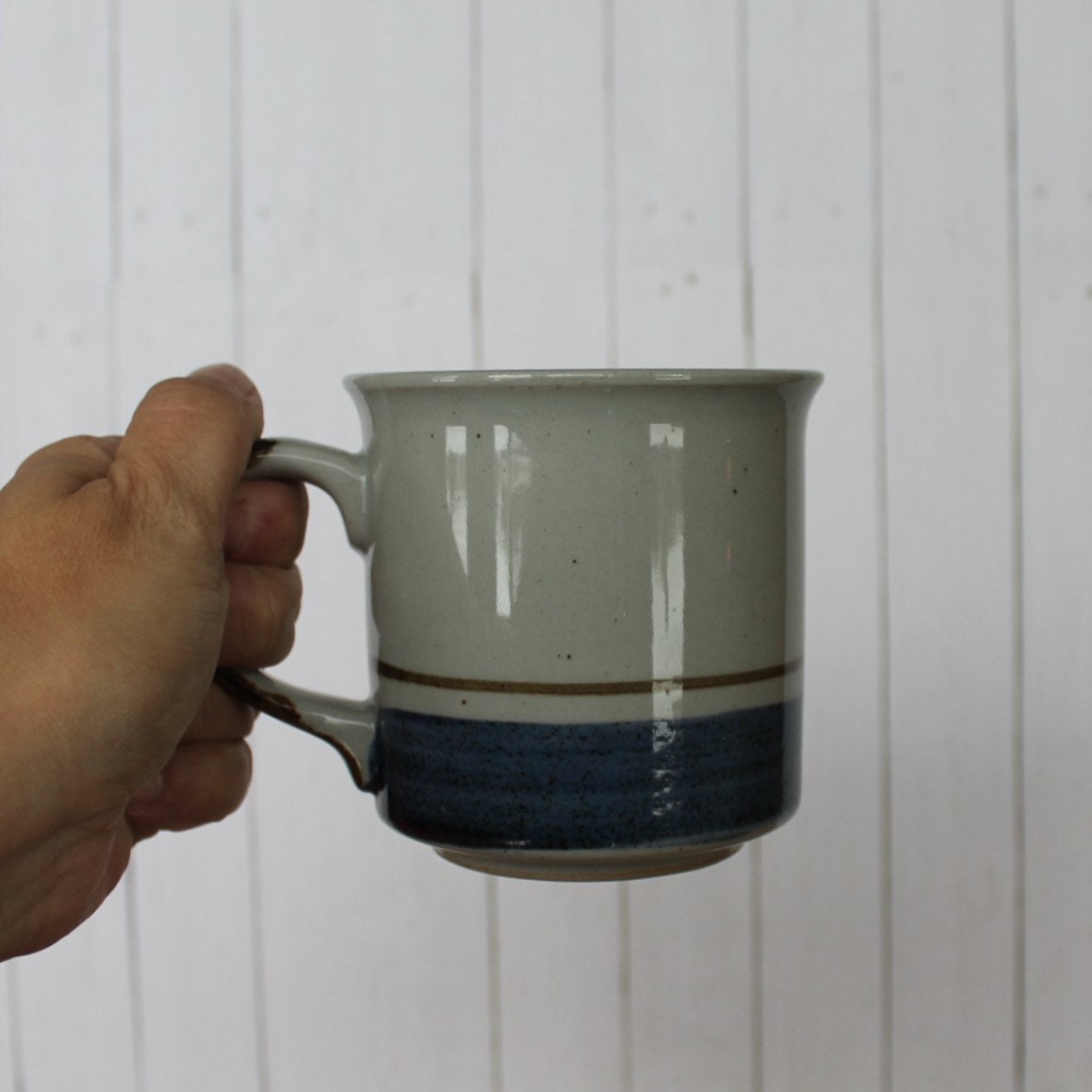 This Oragiri mug is in the Mariner collection, and is a gray stoneware mug with blue bands around the base. This mug is 3 1/2" tall and 3 1/2" in diameter. The mug is a gray stoneware with brown flecks, with a wide band of dark blue around the bottom and a thin brown band above that.