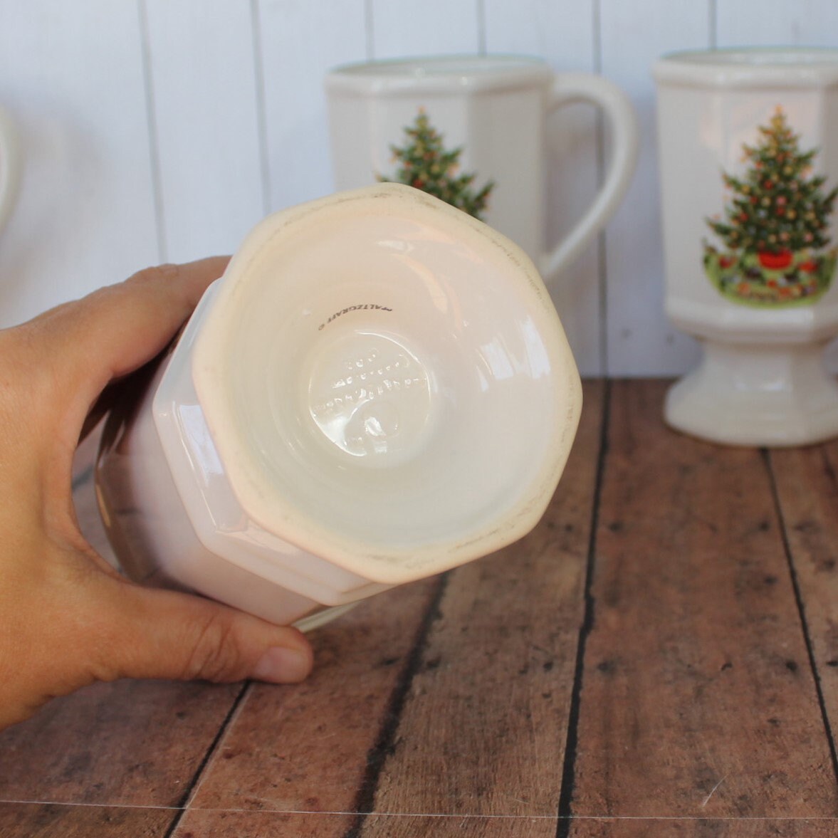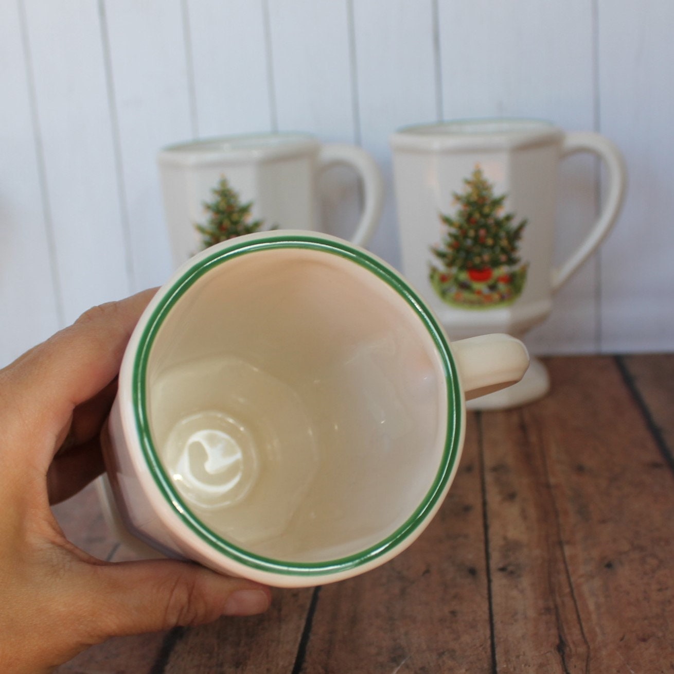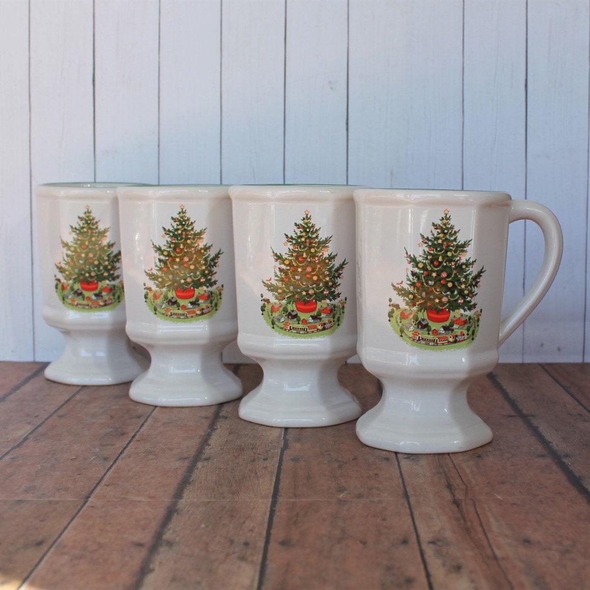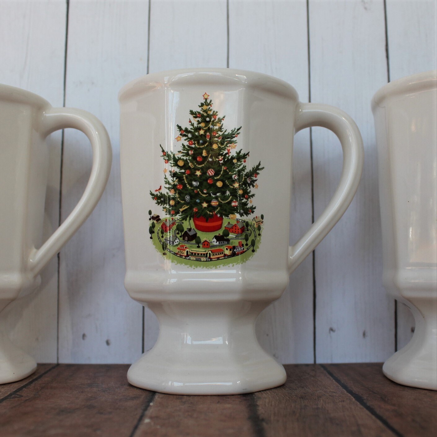 This set of 4 pedestal mugs by Pfaltzgraff are in the Christmas Heritage pattern. They are each 5" tall and 3.25" in diameter, and are a white ceramic. They are decorated on the front of the mug with a Christmas Tree design and a village and train under the tree. The rim is also accented with a green band. The bottoms are marked with the Pfaltzgraff logo. These mugs are a thick, heavy ceramic and weigh almost 1 pound each.
