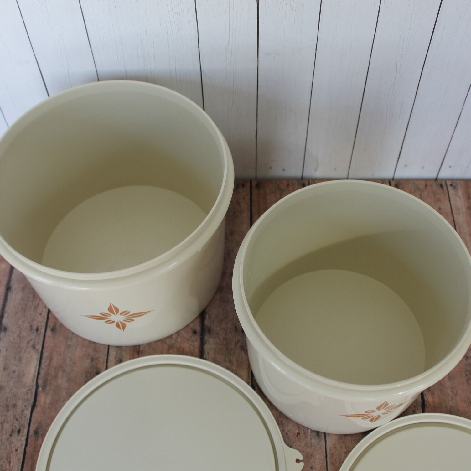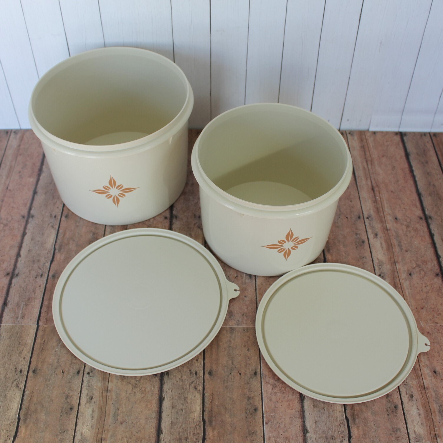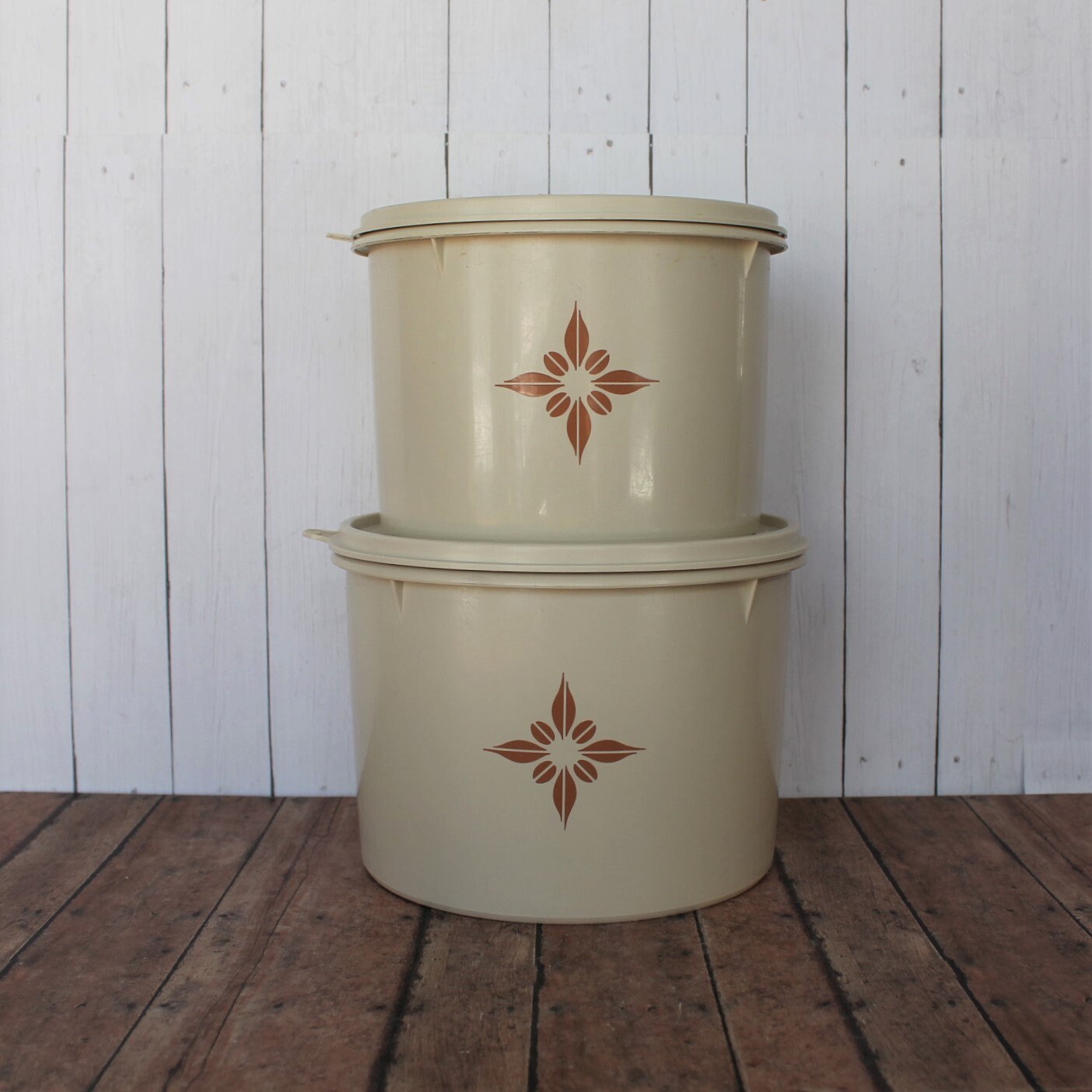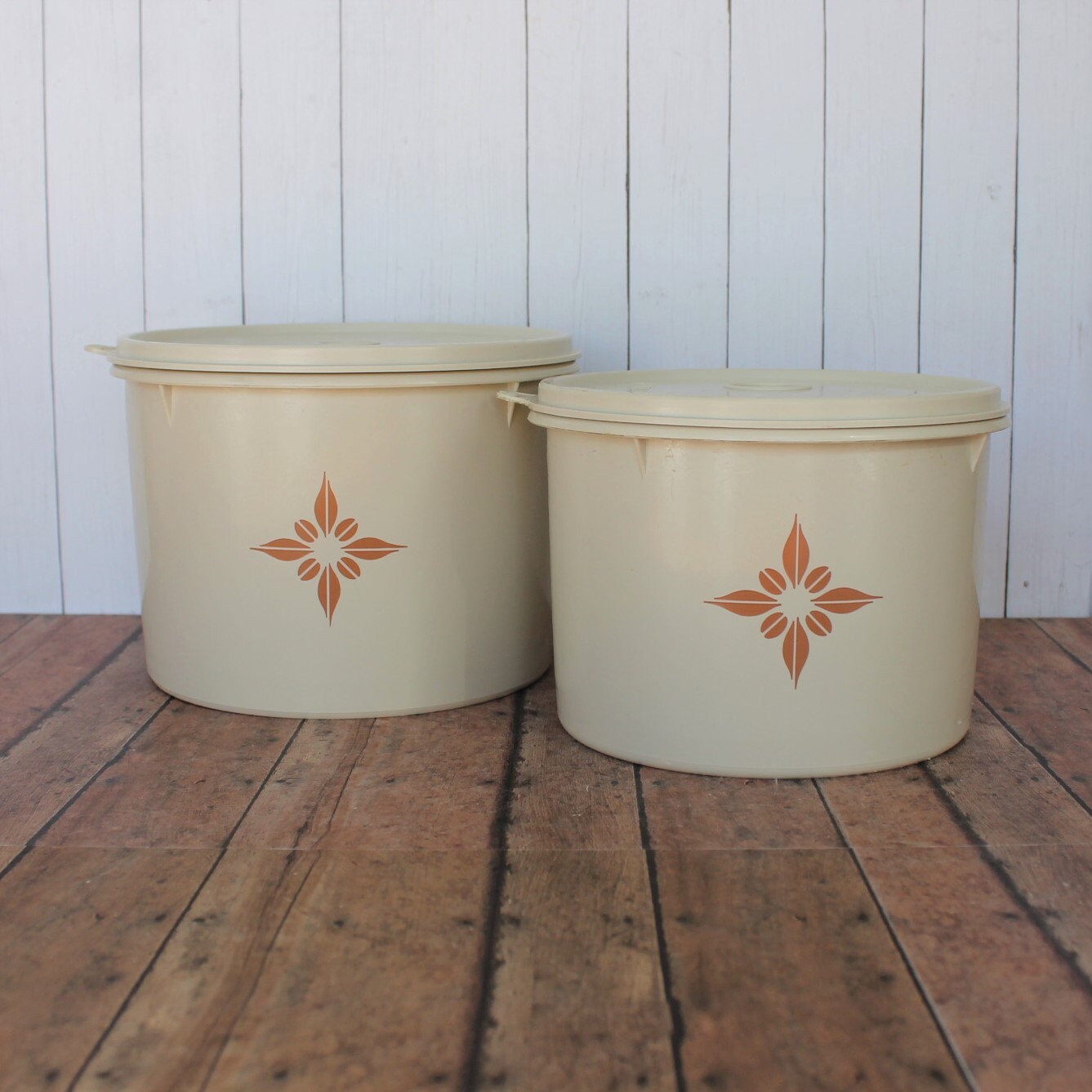 This set of 2 plastic canisters by Tupperware are a matching set of almond colored canisters with a dark tan floral design on the front. This set includes #264-3 with lid 227-47, and canister 265-10 with lid 228-26. The canisters are 4.75" and 5.25" tall and 6.5 and 7.5" in diameter. They are marked Tupperware on the bottoms and on the lids.