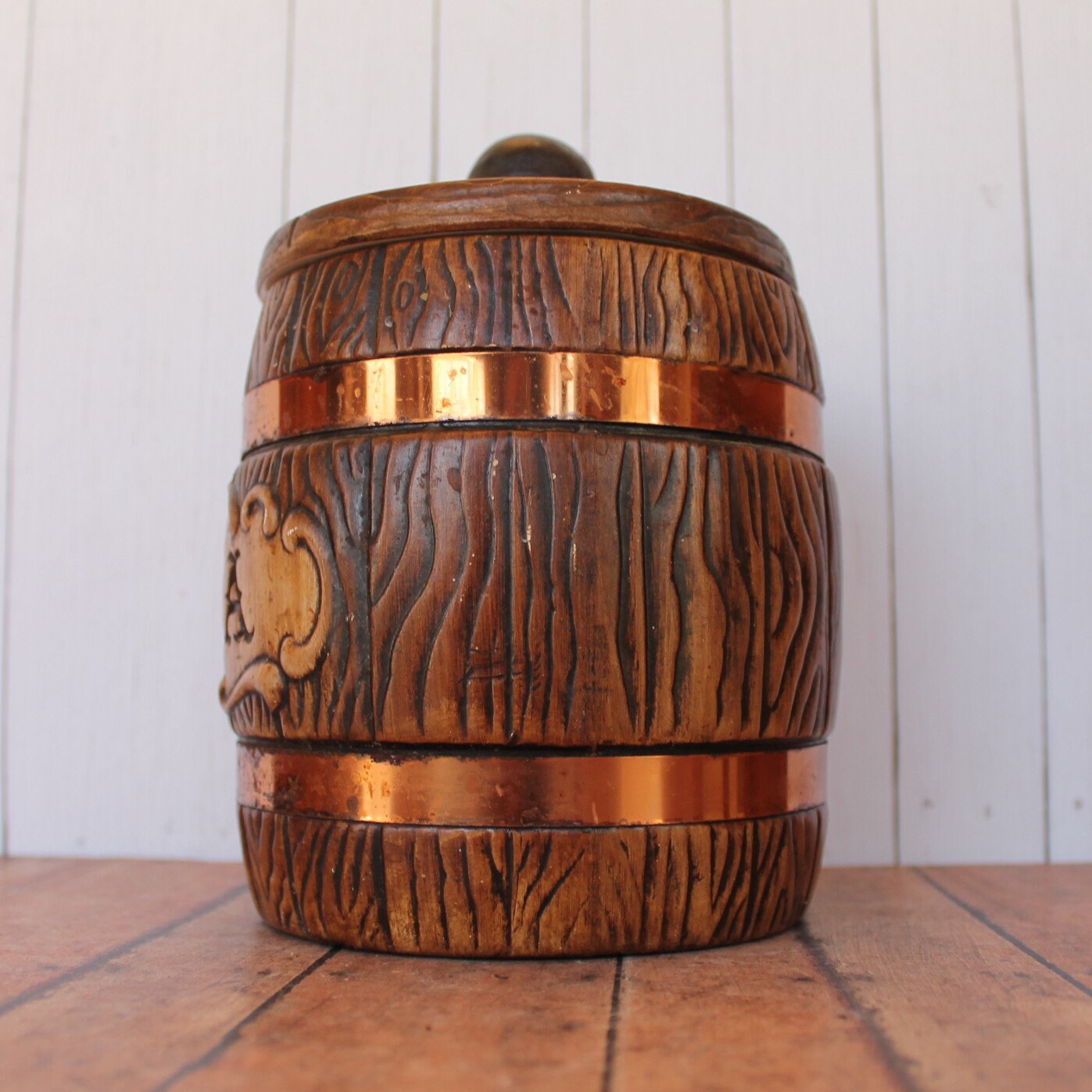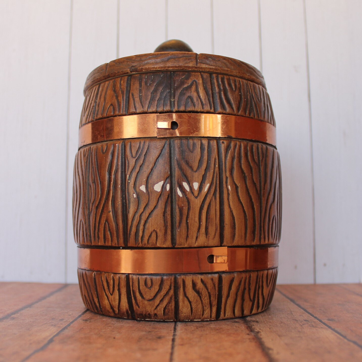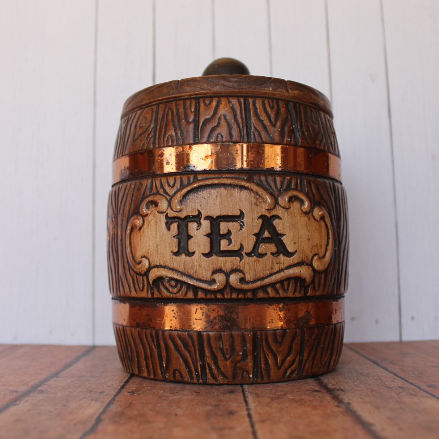 This ceramic tea canister by Treasure Craft is 7" tall and 5" in diameter at the widest point. It is a ceramic piece, and has a faux wood grain design, creating a wooden barrel look. There are 2 metal bands around the piece to accent this barrel style. The front of the piece is marked: TEA. The lid has a round knob for lifting the lid. The back of the piece is marked TREASURE CRAFT USA.