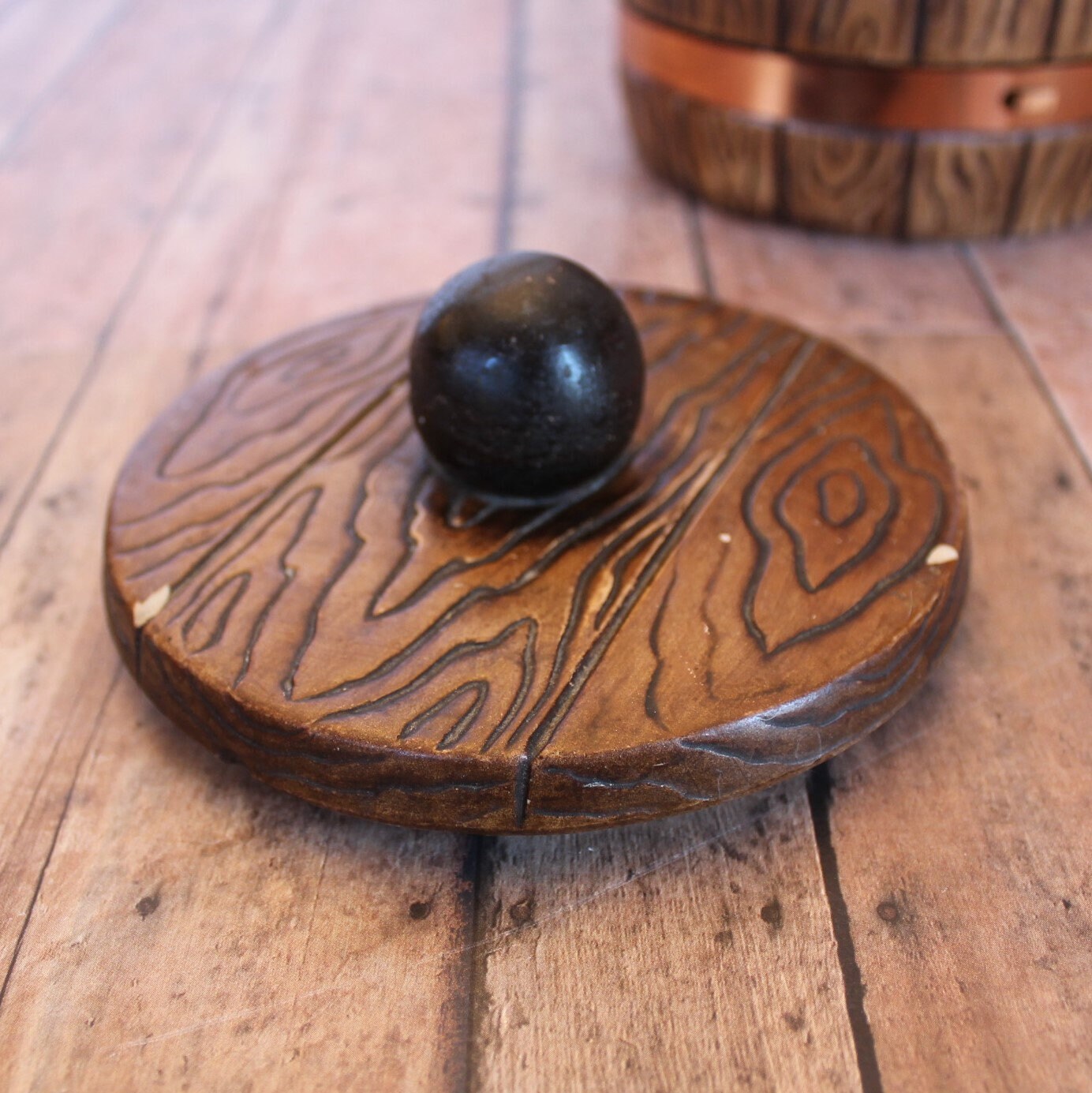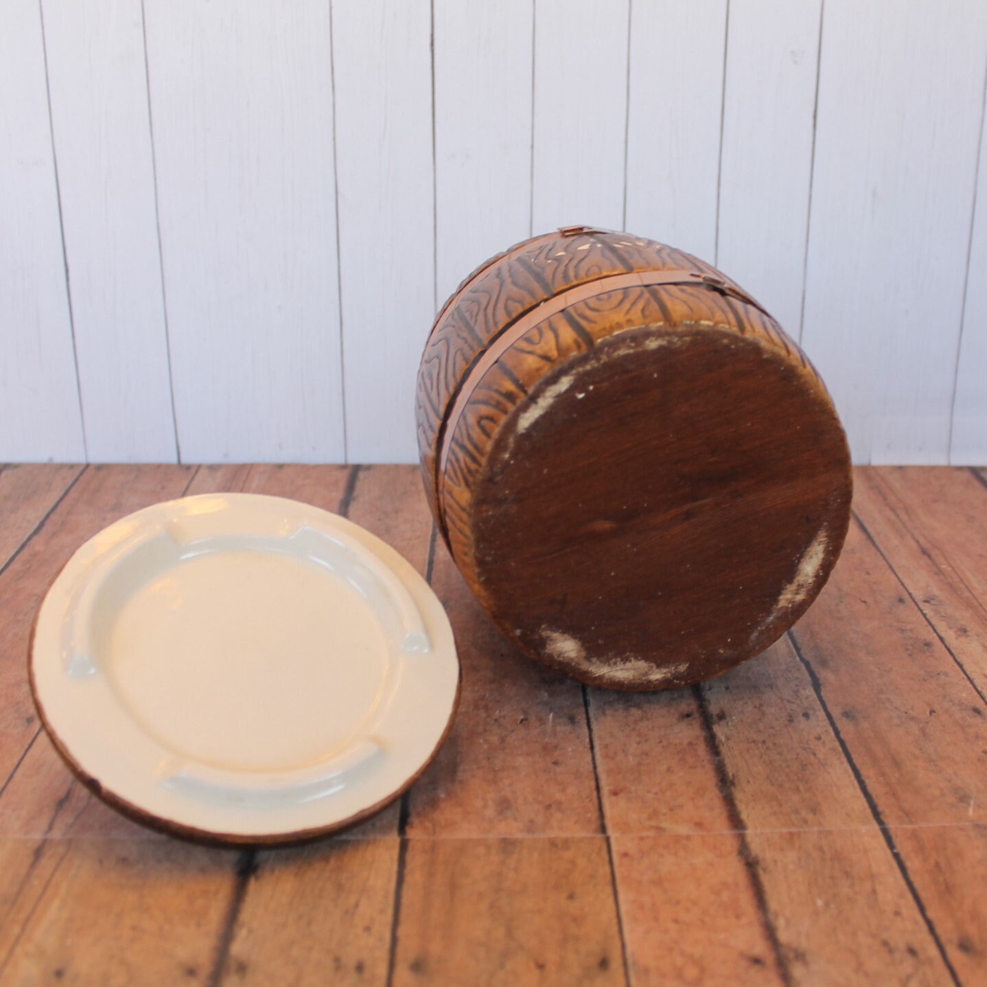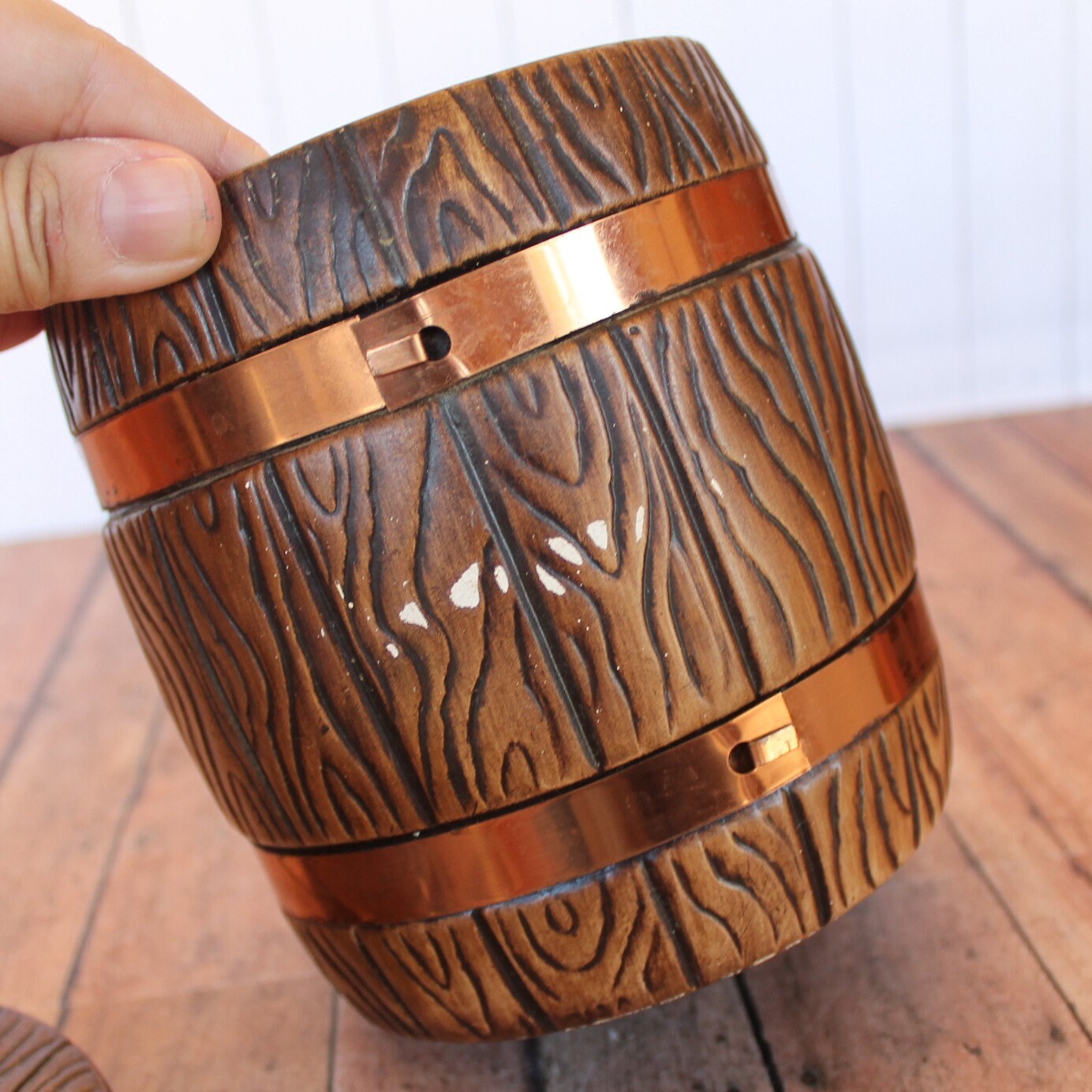 This ceramic tea canister by Treasure Craft is 7" tall and 5" in diameter at the widest point. It is a ceramic piece, and has a faux wood grain design, creating a wooden barrel look. There are 2 metal bands around the piece to accent this barrel style. The front of the piece is marked: TEA. The lid has a round knob for lifting the lid. The back of the piece is marked TREASURE CRAFT USA.