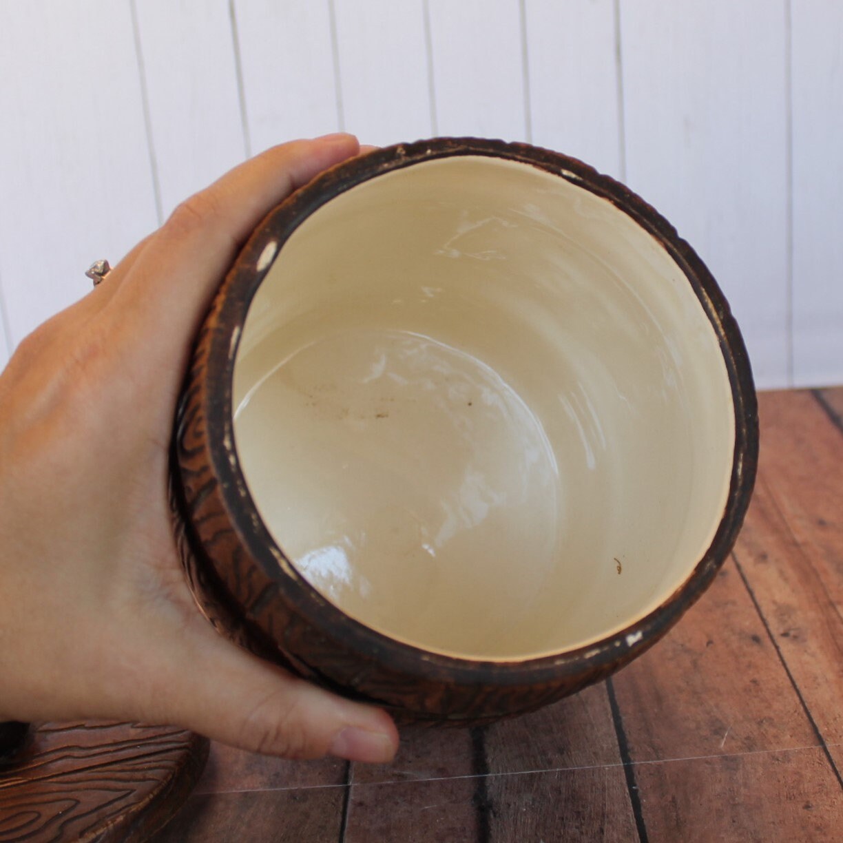 The tea canister is in very nice condition but it is not perfect. There are some light scratches and small nicks in the brown glaze on the surface here and there, and there are 2 small chips on the top of the lid.