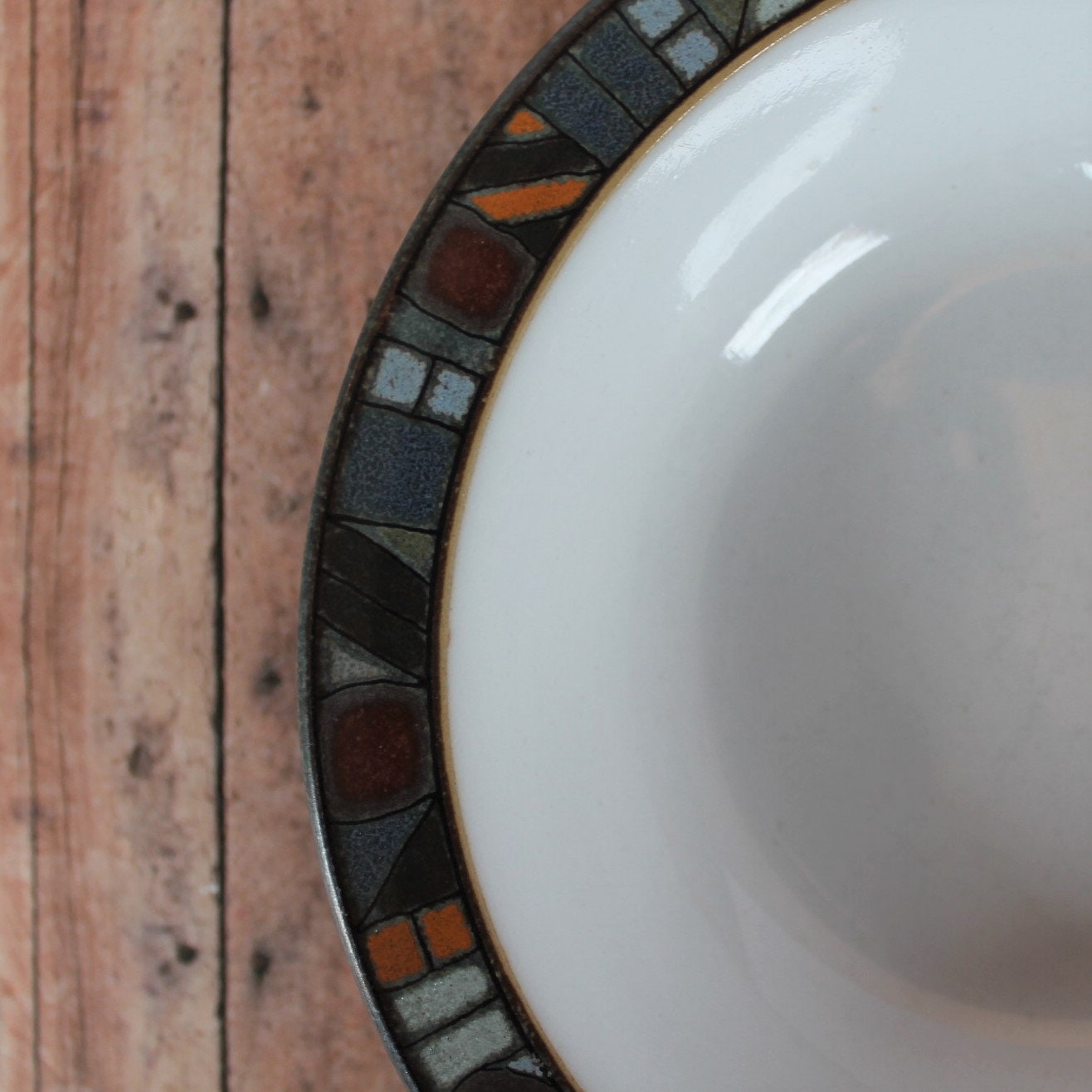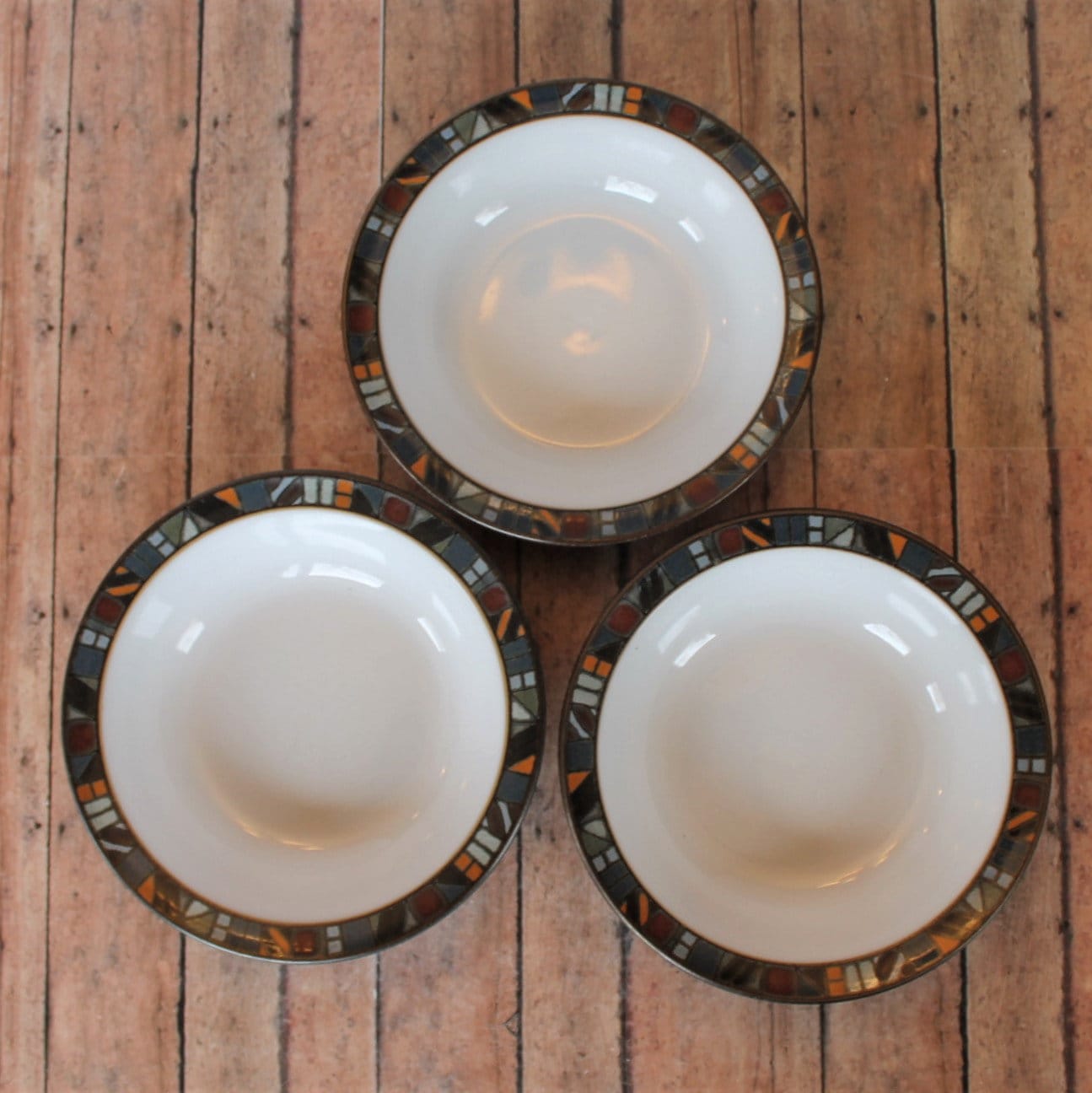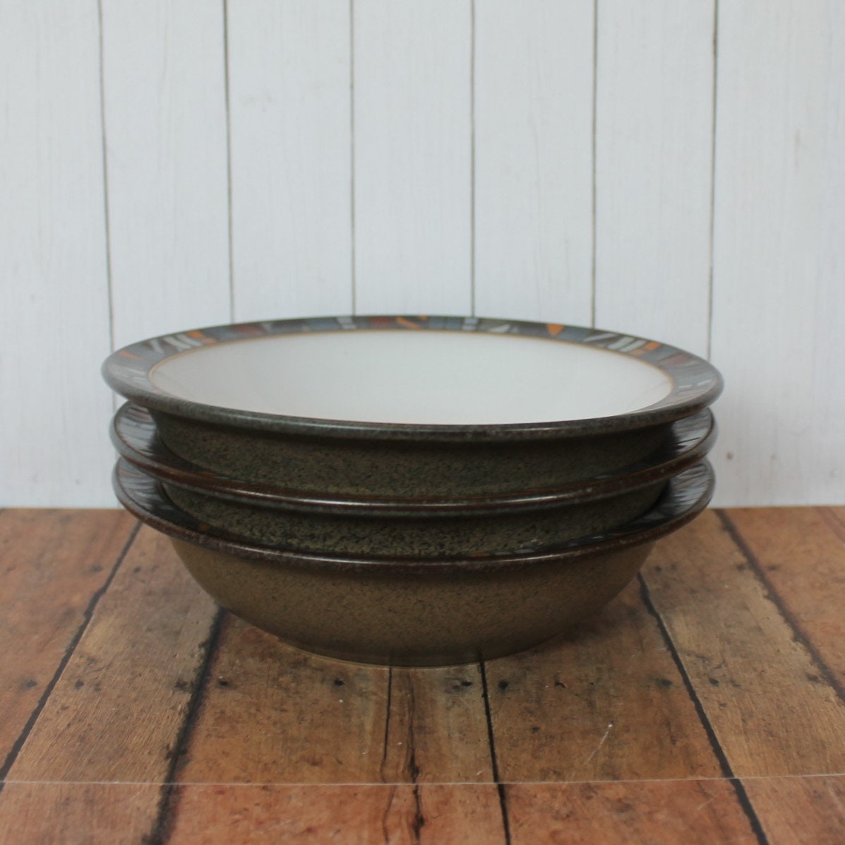 This set of 3 bowls by Denby are in the Marrakesh pattern and are 7" in diameter and 2" tall. They are a white ceramic on the inside, and a green/brown on the outside with a band of multicolor geometric shapes around the rim. The bottoms are marked with the Denby logo.