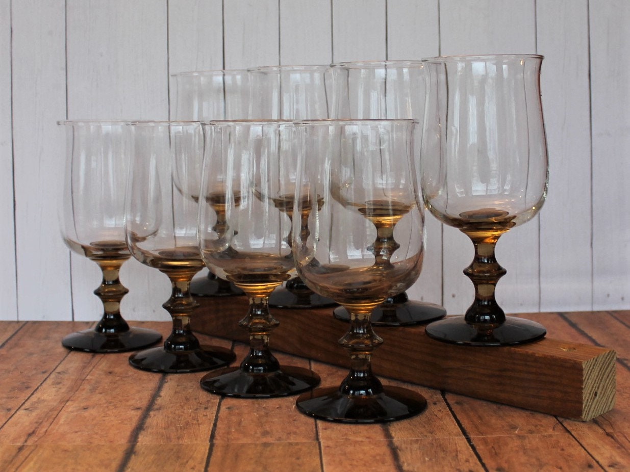 This set of 8 water goblets by Libbey are in the Tulip Brown pattern. These glasses feature a clear glass bowl and a detailed brown stem. Each glass is 6.5" tall and 2.75" in diameter. (These are the larger sized glasses available in this size - the wine glasses are slightly smaller at 5.75" tall.)